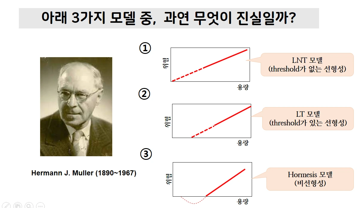 노벨상 수상 후 멀러 교수는 LNT모델 (아래 그림 1번)이 방사선 및 모든 발암물질 관리의 표준모델로 자리 잡도록 하는데 혁혁한 공헌을 세웁니다. 하지만 그는 노벨상 수상 직전 저용량 범위에서는 LNT모델이 적절하지 않을 수 있음을 인지했던 것으로 알려져 있습니다. 최근 나온 영화, 오펜하이머에 등장하는 맨해튼 프로젝트에는 방사선의 생물학적 영향을 연구하는 팀도 존재했는데 당시 멀러 교수는 이 프로젝트의 자문 역할을 했다고 하죠. 이 팀은 두 개 실험을 진행했는데 그중 하나에서 LNT모델과는 전혀 맞지 않은 연구결과 (아래 그림 2번)를 얻었고 멀러 교수도 그 사실을 인지했지만 그는 노벨상 수상시 방사선은 0만이 안전하다는 강력한 메시지를 전 세계에 전합니다. 이 사건에 대한 보다 자세한 내용은 링크 논문을 참고로 하시기 바랍니다.