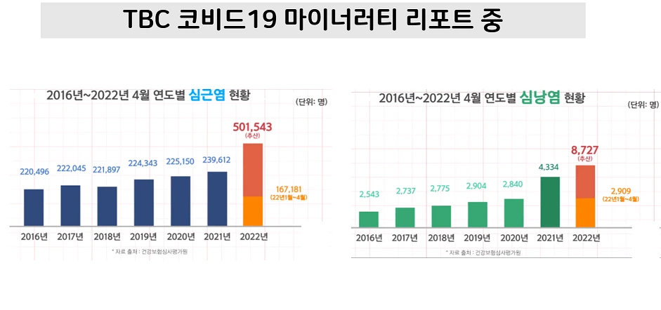 아래는 2022년 9월 대구 지역 방송사인 TBC에서 <코비드 19 마이너러티 리포트>라는 제목으로 방영한 프로그램에 소개된 몇몇 질병의 증가추이입니다. 이 자료는 한 국회의원이 심평원에 요청하여 받은 자료로 2016년부터 2022년 초반까지 다양한 질병명으로 진료받은 환자수 추이를 보여주는데, 붉은색 부분은 추정 수치로 해석에 주의를 요합니다. 하지만 현시점이라면 2022년은 물론이고 2023년까지 질병별로 이 정도 추이분석은 매우 신속하게 할 수 있습니다. 그리고 백신 접종에 대한 의사 결정을 위해서는 자기-대조 환자군 연구니 2단계 최소 제곱법이니 전혀 모르더라도 이런 정보만 주어져도 충분합니다.