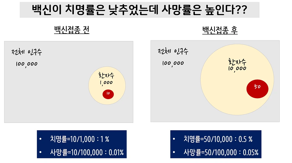J교수는 코로나19 백신이 코로나19 사망률을 높이는 것은 불가능하기 때문에 처음부터 코로나19를 총사망에서 제외하는 것이 더 적절하다고 판단한 걸까요? 하지만 코로나19 사망자수 헤아리기에 아무런 오류가 없고 코로나19 백신이 고위험군의 중증도와 치명률을 낮추는 것이 100% 진실이라 하더라도, 인구집단의 관점에서 본다면 백신은 코로나19 사망률을 높일 수 있습니다.