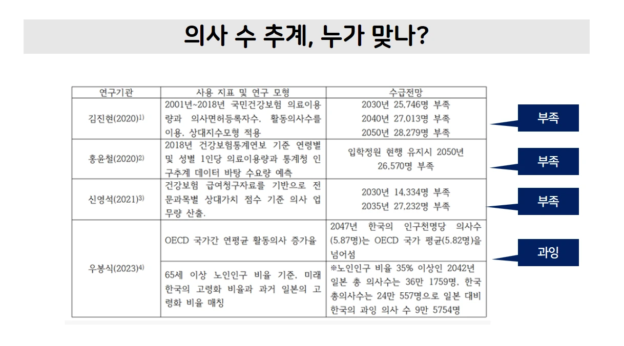 의사수 추계와 관련하여 대중들은 꽤나 혼란스럽게 느껴질 수 있습니다. 추계하는 사람에 따라 엄청나게 부족하다부터 부족하지 않다, 오히려 남아돈다까지 광범위한 스펙트럼이 존재하기 때문입니다. 전자는 정부 측 주장이고 후자는 주로 의사 측 주장입니다. 대중들은 아니 어떻게 그렇게 다를 수 있나? 누군가는 거짓말을 하는 것이 분명하고 그 거짓말은 당연히 직역이기주의에 사로잡힌 의사들이 하는 것이라고 믿습니다. 하지만 코로나 사태 시 대부분 감염병 예측 수리모델링이 엉터리였음이 판명되었듯, 의사수 추계와 같은 예측모델도 어떤 결과가 나오든 신뢰할 수 없는 것은 마찬가지입니다.