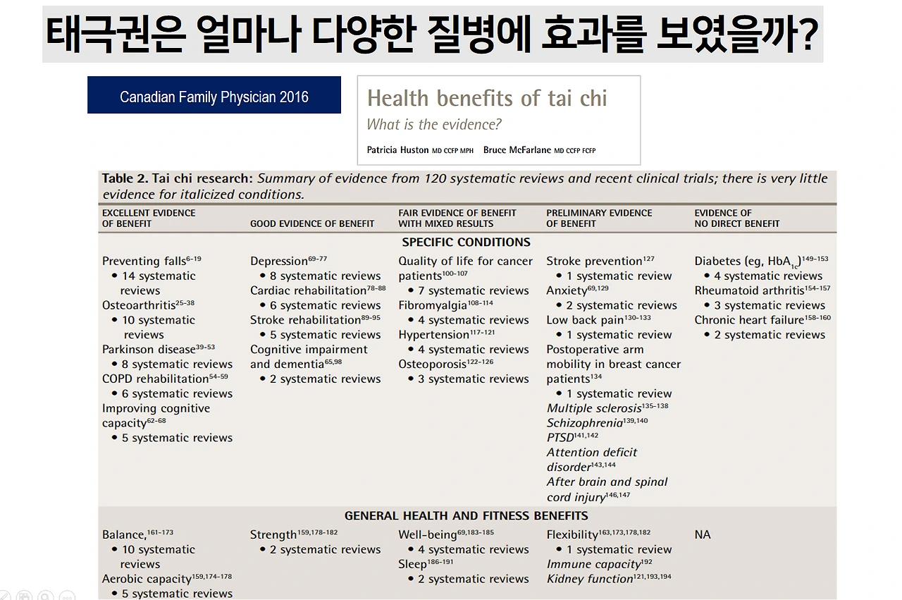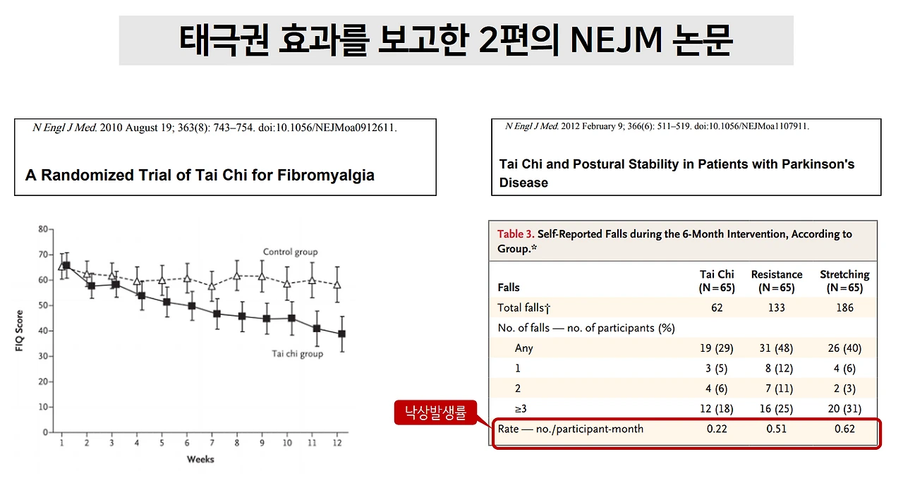 첫 번째 논문은 대표적인 만성통증질환인 섬유근육통 환자들을 대상으로 한 것으로 태극권을 일주일에 2번, 약 3개월 정도 시행하고 나니 증상이 뚜렷하게 호전됨을 보고합니다. 두 번째 논문은 알츠하이머 다음으로 흔한 퇴행성 뇌질환인 파킨슨병 환자들을 대상으로 태극권 효과를 평가한 것으로 이 논문에서는 흥미롭게도 태극권, 근력운동, 스트레칭 3가지 운동의 효과를 비교했습니다. 결과적으로 태극권군의 낙상발생률이 다른 운동군보다 2~3배 낮았음을 보고했고요. 이런 연구들에서 적용한 태극권은 현란하고 복잡한 고난이도 동작이 아니라 환자들도 쉽게 따라할 수 있는 기본 동작들을 반복하는 정도의 저난이도 태극권이었죠.
