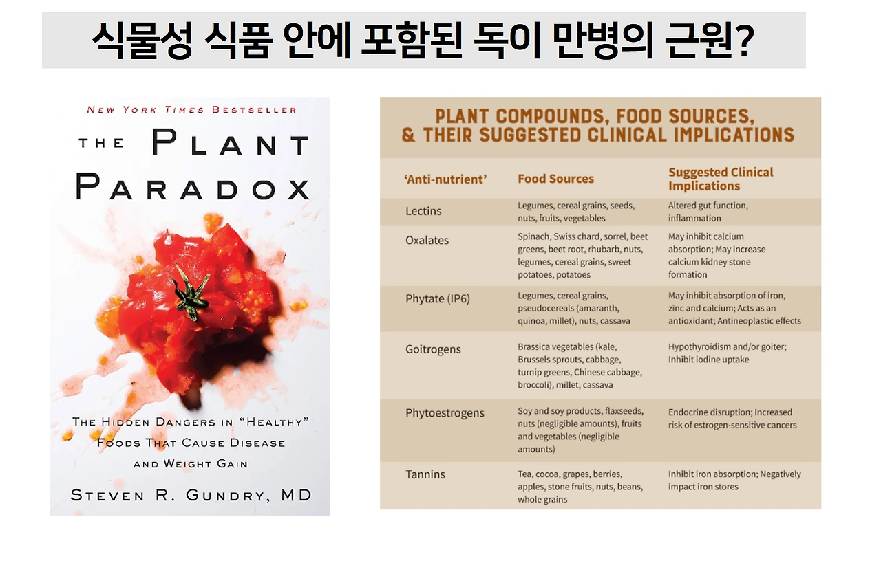 최근 저탄고지 열풍과 함께 식물성 식품 자체를 해롭다고 주장하는 글 혹은 동영상들이 꽤 많이 눈에 띄는군요. 각종 해부학적, 생리적, 생화학적 특성들을 열거하면서 인간은 진화론적으로 육식동물임이 분명하며 동물성식품만으로 사는 것이 지당하다는 의견들을 너무 자신 있게 내놓고 있어 당황스럽기까지 하군요. 불을 사용하기 전 인간과 같은 구강과 치아 구조로 어떻게 육식을 주식으로 할 수 있었는지는 알 수 없으나, 어쨌든 그들은 식물성 식품 안에 포함된 각종 독성물질들이 우리를 병들게 하고 인간은 식이섬유를 소화시키지 못하므로 식물성 식품들을 기본적으로 피해야 할 식품으로 분류하고 있었습니다.