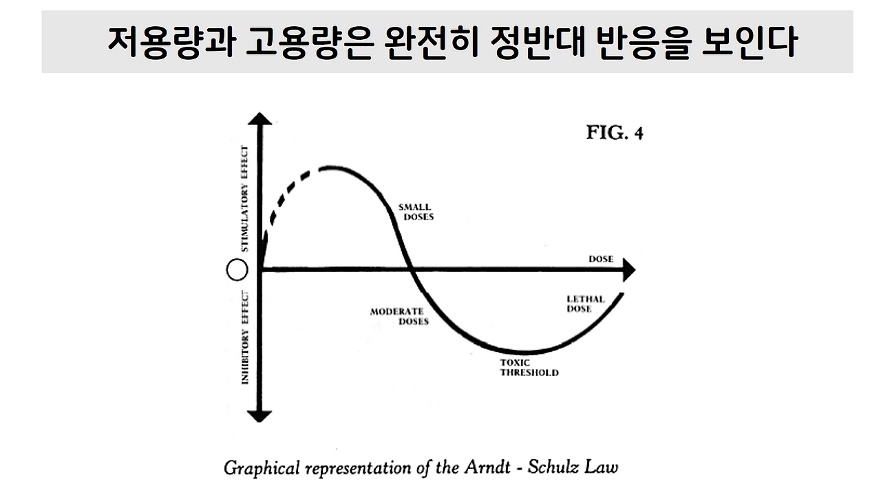 여기서 중요한 사실은 동종요법과의 관계가 아니라 슐츠 교수의 연구결과가 다른 연구자들에 의하여 충분히 재현되었다는 점입니다. 19세기 후반부터 20세기 초중반까지 많은 연구자들이 다양한 물질을 가지고 슐츠 교수와 비슷한 실험을 반복했는데, 고농도에서 독성을 보이는 수많은 물질들이 저농도에서는 성장과 번식을 도울 수 있다는 사실을 확인하게 됩니다. 여기에는 일반적으로 독극물로 알려진 종류들 외에 소금, 요오드, 아연, 철분 등과 같은 필수 원소들도 포함됩니다. 그리고 유사한 결과가 효모뿐만 아니라 박테리아, 곰팡이, 식물 등 다양한 실험모델에서 확인됨에 따라 매우 보편적인 생명현상일 가능성을 시사했죠.