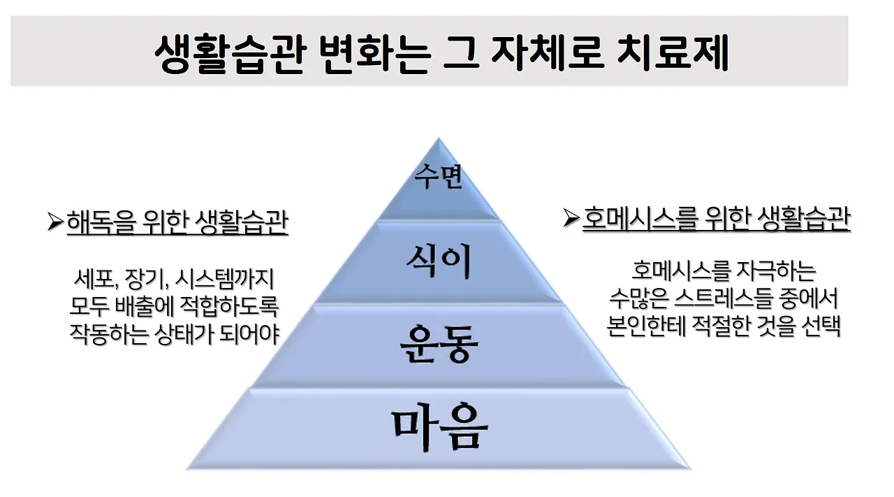 그런데 현실에서 생활습관이 중요한 가장 큰 이유는, 아마 이 방법만이 호메시스 작동과 해독을 동시에 가능케 하는 거의 유일한 방법이기 때문일 겁니다. 모든 것이 오염되어 버린 현대사회에서 해독시켜야 할 유해물질 수는 기하급수적으로 증가하고 있지만, 가공식품과 정제탄수화물 중심의 식습관과 신체 활동량이 적은 생활습관으로 인하여 사람들은 해독과 점점 더 멀어지고 있습니다.