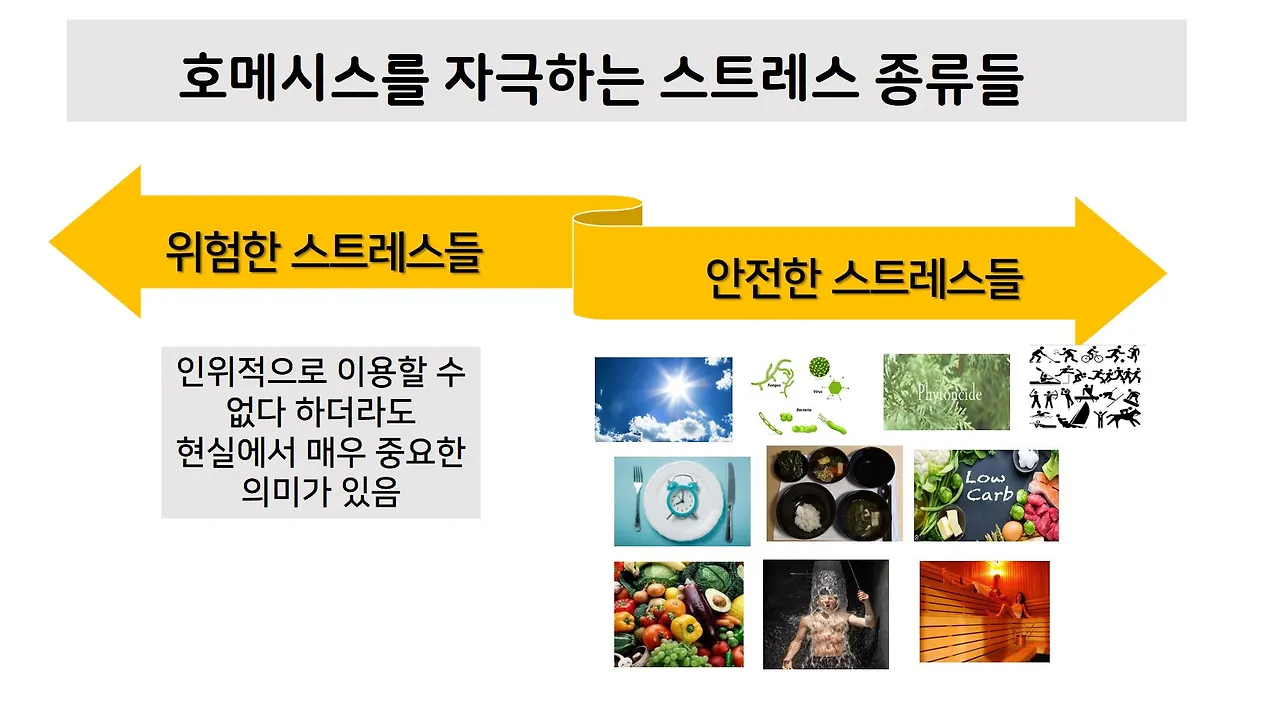 진화적 적응을 거친 또 다른 형태의 스트레스가 <간헐적 단식, 저탄수화물식, 운동, 냉수욕, 사우나, 파이토케미컬..,> 등과 같은 생활습관입니다. 현대인들은 먹고 싶은 대로 먹고, 힘들게 움직이지 않고, 쾌적한 온도에서 지내는 삶을 추구해 왔지만. 이는 호메시스 작동과는 대척점에 있는 생활습관입니다. 호메시스 작동에 필요한 스트레스를 주기적으로 경험하기 위해서는 오래전 인류가 살아왔던 조건을 인위적으로 재현할 필요가 있습니다.