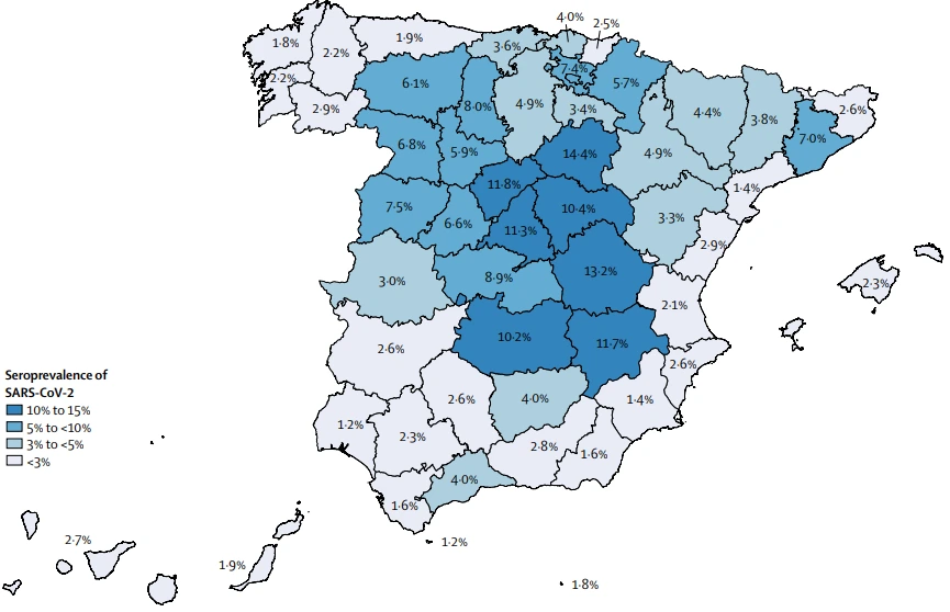 최근 스페인 전역에서 6만 명이 넘는 사람들을 대상으로 시행한 코로나 항체조사 결과가 발표된 바 있습니다. 그 전의 항체 조사와는 달리 Lancet이라는 역사와 전통을 자랑하는 최고의 의학저널에 실린 논문이라서 그런지 특히 외신에서 대서특필을 했더군요. 결론만 요약하자면 스페인과 같이 코로나 발생과 사망이 매우 많았던 국가도 평균 항체 양성률은 5%, 마드리드와 같이 환자가 폭발한 지역도 10% 정도에 불과했다는 것입니다.