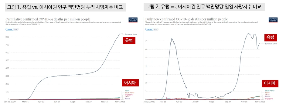그림 1은 지금까지 누적 사망자수를 인구 백만명당으로, 그림 2는 일일 사망자수를 인구 백만명당으로 나타낸 것입니다. 유럽권 국가들은 EU 국가들을 평균한 것이고 아시아권은 한국, 일본, 중국, 타이완, 싱가포르의 결과입니다. 엄청난 차이죠. 앞서 글에서 이런 차이를 방역대책 덕분으로 설명하고자 하는 것은 수능 1등과 꼴찌의 차이를 과외선생 혹은 참고서 덕분이라고 이야기하는 것과 똑같다는 표현을 한 적이 있습니다만, 이처럼 큰 차이는 어떤 생물학적인 원인이 존재해야 설명 가능합니다. 저는 여러 번 설명드린 교차면역을 핵심 원인으로 보고 있고요.