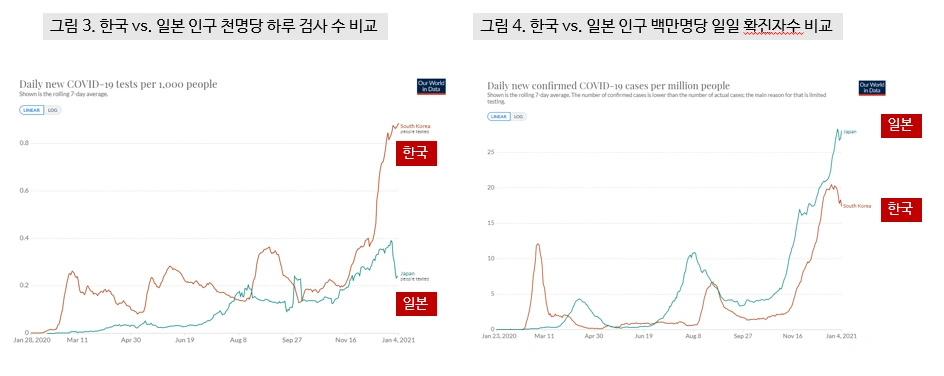 현시점 우리가 가장 주의 깊게 봐야 할 국가는 일본입니다. 아시아권에서 느슨한 대응을 한 거의 유일한 국가로, 소위 K방역의 대척점에 있기 때문입니다. 그림 3은 한국과 일본의 인구 천명당 하루 PCR 검사수를 비교한 그래프로, 일본은 작년 5월까지 PCR 검사조차 제대로 하지 않았고 지금도 검사율이 많이 낮습니다. 초기에는 임상적으로 폐렴에 준하는 증상이 있어야만 PCR 검사를 해주었는데, 양성 확진율이 40~50%에 가까운 적도 있었죠.따라서 코비드 19의 높은 전파력을 고려하면 유행 초기부터 지역사회 전파가 광범위하게 발생했을 것으로 추정됩니다. 그러나 일본의 인구 백만명당 코비드 19 사망률은 한국과 별 차이가 없습니다 (우리나라보다 2~3배 높은 고령인구 비율을 고려해서 비교해야 합니다). 초과사망도 뚜렷하게 관찰되지 않는데, 이는 단순히 검사를 하지 않아서 코비드19 사망률이 낮은 것이 아니라는 의미입니다. 그림 4는 인구 백만명당 일일 확진자수를 보여주고 있는데, 두 국가의 확진자 수 "증감 패턴"조차 유사함을 알 수 있습니다 (확진자 수 자체를 비교하는 것은 별 의미 없습니다).
