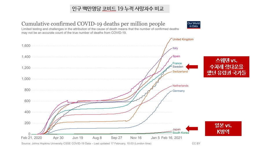 지역사회 전파가 발생했던 국가들끼리만 비교해 본다면 스웨덴도 일본도 결코 방역에 실패한 국가가 아닙니다. 마스크도 하지 않고 사회를 열어 두었던 스웨덴의 코비드 19 사망률이 수차례 전면 락다운을 했던 다른 유럽권 국가들의 평균 사망률과 유사하고, PCR 검사조차 제대로 하지 않은 일본의 코비드 19 사망률이 개인정보와 사생활 털어 가면서 K방역으로 대응했던 우리나라와 별 차이가 없는데 어떻게 실패일 수 있겠습니까? 제가 올린 다른 글들은 읽지 않고, 오로지 이 글만 읽는 분들을 위하여 다시 한번 그래프로 보여드리겠습니다.