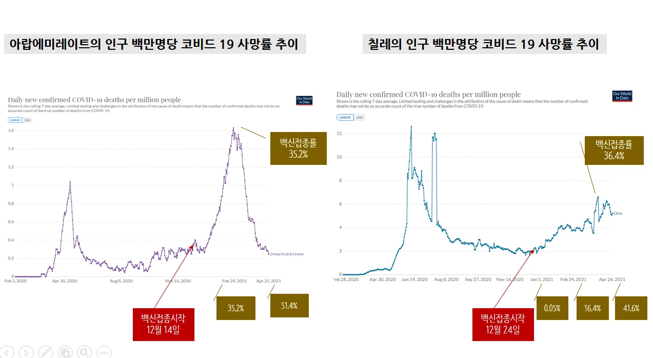 추가적으로 백신 접종률이 영국과 비슷한 아랍에미레이트와 칠레의 상황도 살펴보았습니다. 아랍에미레이트는 시간순으로 볼 때 좀 더 뚜렷한 패턴이 있군요. 12월 14일 백신 접종을 시작해서 사망률의 정점을 보인 시기가 2월 25일, 이 당시 백신 접종률은 35.2%였습니다. 현재 사망률이 떨어지기는 했으나 백신 접종전과 비슷한 수준의 확진자와 사망자는 여전히 나오고 있습니다. 한편 칠레는 백신 접종 후부터 사망률이 조금씩 증가하긴 하나 뚜렷한 정점을 보이고 있지 않으며 백신 접종률이 50%에 가까운 현재까지도 여전히 증가 추세입니다. 다른 세 국가와 비교할 때, 칠레는 초기 백신 접종 속도가 많이 느렸다는 차이가 있군요. 백신 종류는 국가마다 달랐는데, 이스라엘은 화이자, 영국은 화이자와 아스트라제니카, 아랍에미레이트와 칠레는 중국산 백신을 주로 접종했습니다.