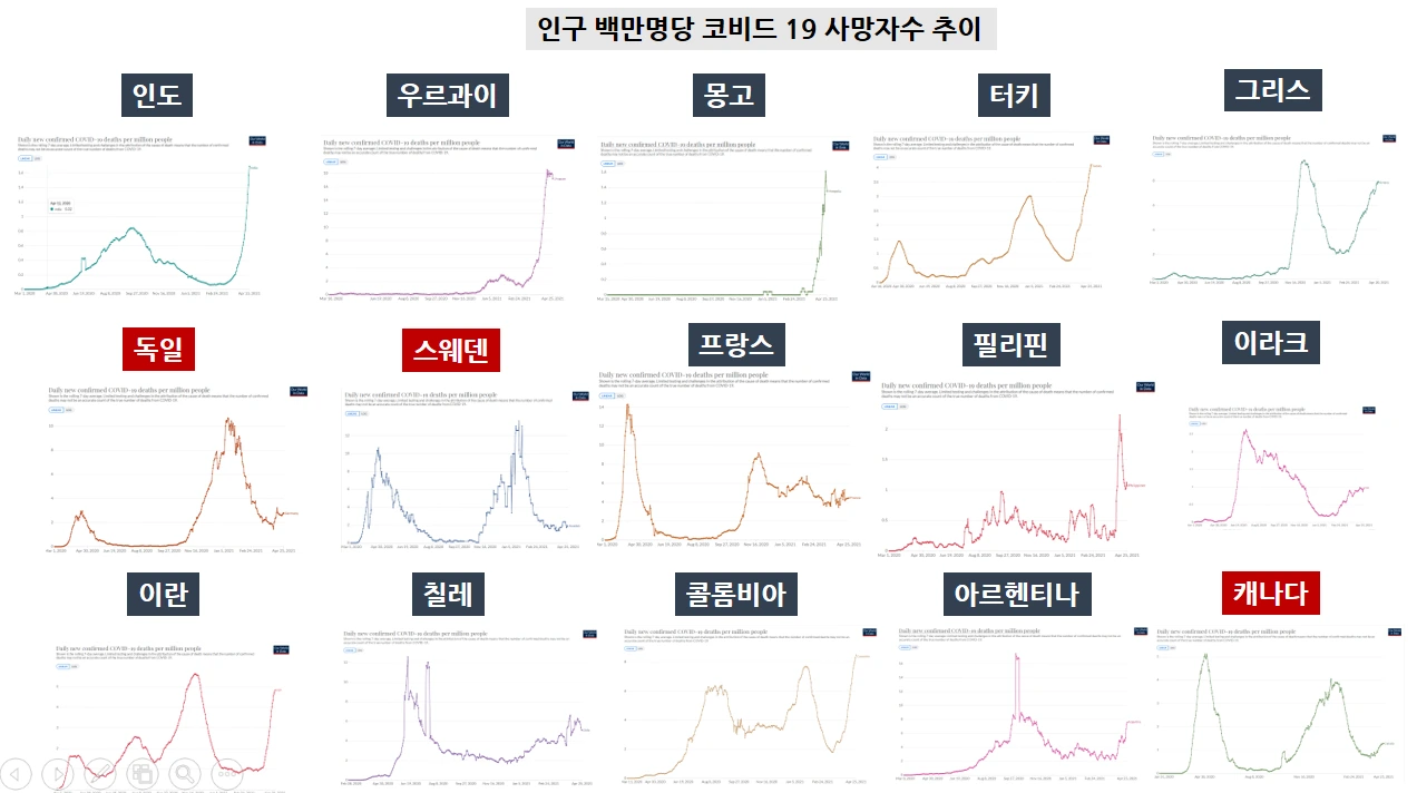 먼저1편에서 언급한 확진자수가 급증하는 국가들의 인구 백만명당 코비드 19 사망자수 추이를 확인해보았습니다. 대부분확진자수가급증하면서사망자수도같이증가하는패턴을보였습니다만예외적인국가들도있군요. 독일, 스웨덴, 캐나다등과같이의료시스템이잘갖춰진나라들입니다. 확진자 급증에도불구하고사망률은 여전히 낮게 유지하고 있네요. 그러나 1차 유행시에는 유행 곡선의 정점을 보인 후 깨끗하게 사망자 0에 가깝게 떨어졌습니다만, 이번에는 작은 숫자이긴 하나 일정 수준 사망자가 계속 나오고 있는 상태군요.