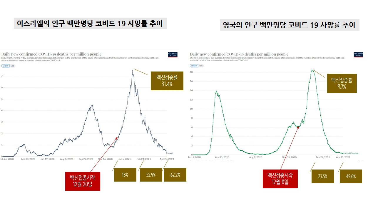 그런데 이스라엘과 영국이 현재 결과에 이를 때까지 확진자와 사망자 급증 현상이 없었는지 궁금하더군요. Our world in data에서 제공하는 이스라엘과 영국의 인구 백만명당 코비드 19 사망자 추이와 백신 접종 시작 날짜와 백신 접종률을 한번 맞춰보았습니다. 음.. 영국은 12월 8일, 이스라엘은 12월 20일부터 백신 접종을 시작했는데, 아래 그래프에서 보듯 백신 접종 시작 시점과 코비드 19 사망률 증가 시점이 상당히 겹쳐 보이네요. 두 국가 모두 1월 25일 전후에 사망률의 정점을 보이다가 급격히 떨어지기 시작하는데, 이때 백신 접종률이 이스라엘은 31.4%인데 비하여 영국은 9.7% 정도입니다. 영국의 사망률 감소에는 자연감염을 통하여 올라간 집단면역이 상당한 역할을 했을 것으로 보입니다.
