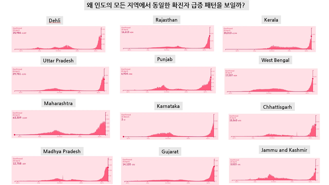 그리고 자료 검색 중 인도의 코비드 19 관련 통계 사이트(https://www.covid19india.org/)를 알게 되었습니다. 제가 알고 싶었던 인도 각 지역별 정보를 Our world in data만큼이나 상세하게 제공하고 있더군요. 1차 유행의 시점과 패턴은 지역마다 차이가 있었으나 최근의 확진자 급증 패턴은 그 넓은 인도의 모든 지역에서 유사하게 존재함을 확인할 수 있었습니다. 아래 그래프는 그중 일부입니다.