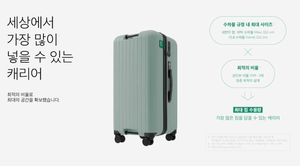 캐리어의 기능은 지나치게 많이 설명하지 않고자 했다. 녹이기 어려운 구조이기도 했고, "시간이 지나고 좋은 걸 써보니까"라는 문장에 은유적으로 담고자 했다.