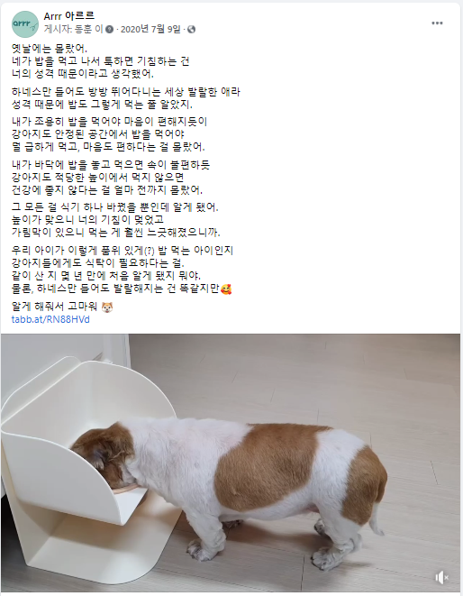 생활 속의 몰랐던 불편함을 제품을 통해 해소한 가장 좋은 사례라는 생각이 들어 이 스토리를 장문형태로 제작해보면 어떨까 하는 생각이 들었다. 말 못하는 동물의 몰랐던 불편함을 해소한 내용이니만큼 글 전체의 구조를 신경써서 기획했다. 사람의 입장과 동물의 입장이 대조되며 이 과정에서 식기의 기능을 자연스럽게 드러낼 수 있도록 작성했다.