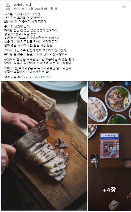 대부분 구운 고기를 좋아하지만 수육에 대한 분명한 니즈 혹은 충성도를 가진 사람들이 있다. 이 사람들이 우리 가게를 소개하는 느낌의 글이라면 어떨까? 보통 깊게 빠진 사람들은 자신이 이걸 왜 좋아하는지 설명하고 영업하려는 시도를 하니 그런 느낌을 담아보고자 했다. 그렇게 아래와 같은 광고를 썼고, 결과도 좋았다. 해당 광고가 상위권 매출을 기록했다.