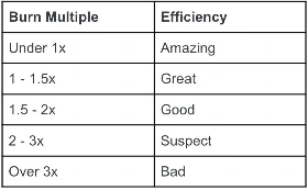 Burn multiple은 Net Burn(소진한 현금)과 New ARR을 비교하는 지표입니다. 이 지표는 2를 넘지 않는 것이 좋습니다. 이번달 소진한 현금이 1.2억원이고 New MRR(신규월간반복매출)이 500만원이라면 New ARR(신규년간반복매출, New MRR X 12)은 6,000만원이 되므로 Burn multiple은 2가 됩니다.