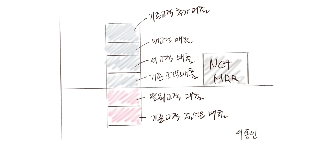 Net MRR = 기존 고객 매출(기존 고객 전달 매출) + 기존 고객의 추가된 매출 + 새고객 매출 + 재고객 매출 - 탈퇴 고객 매출 - 기존고객의 줄어든 매출