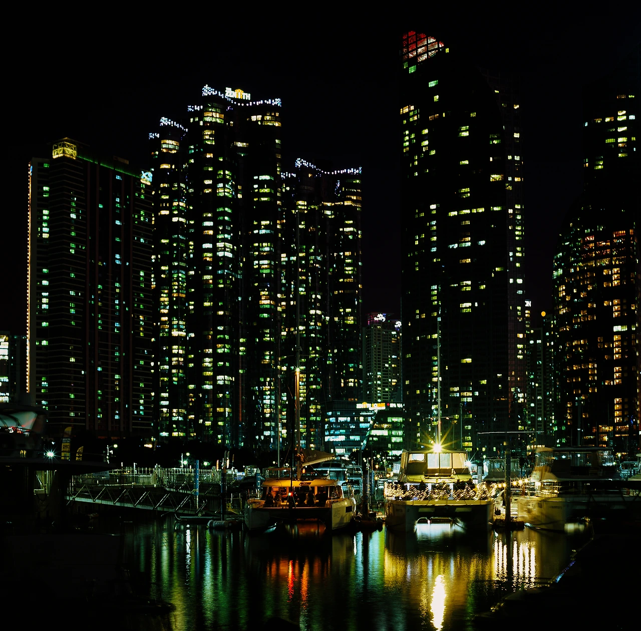 어둠 속에서 휘황찬란하게 빛나는 초고층 건물과