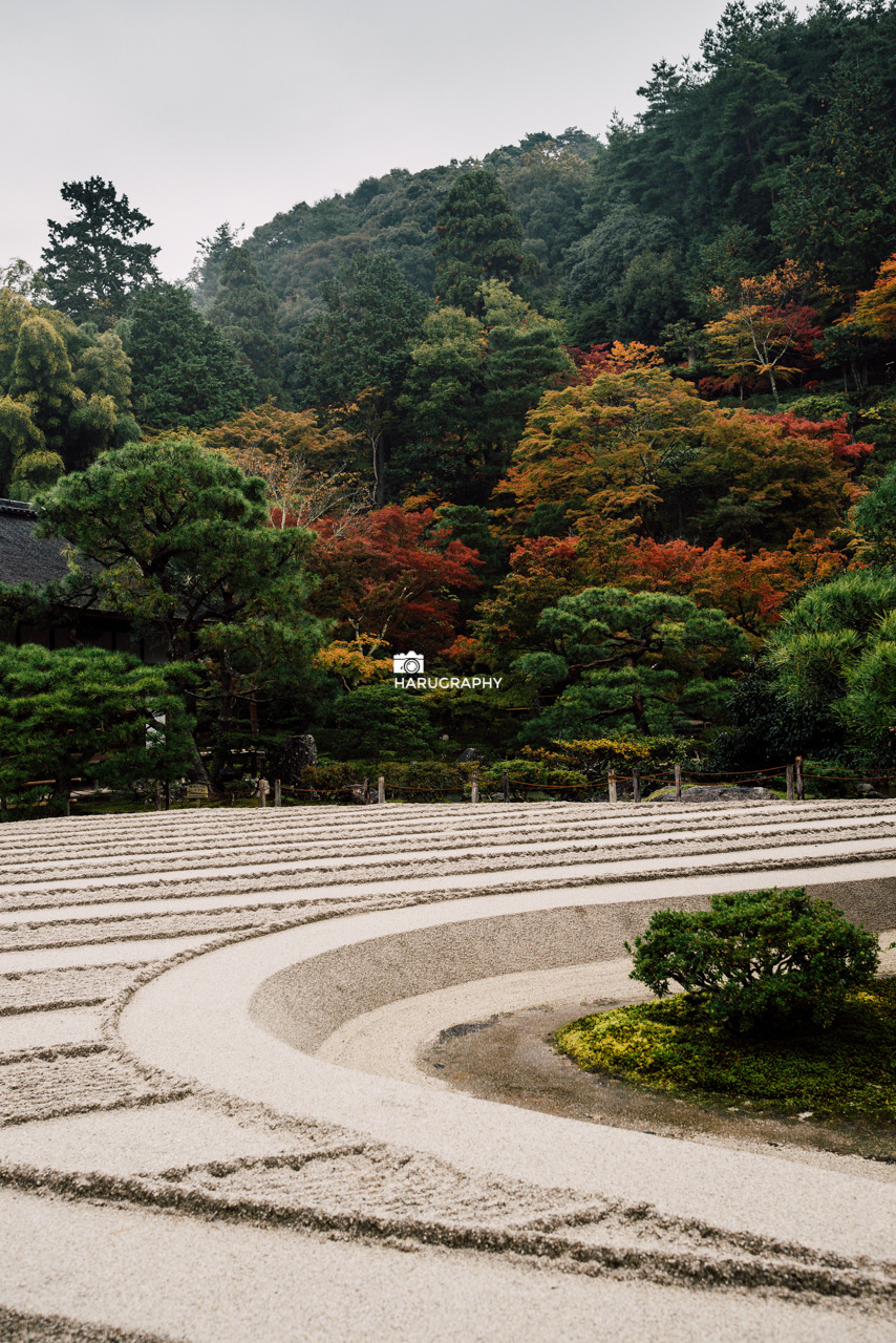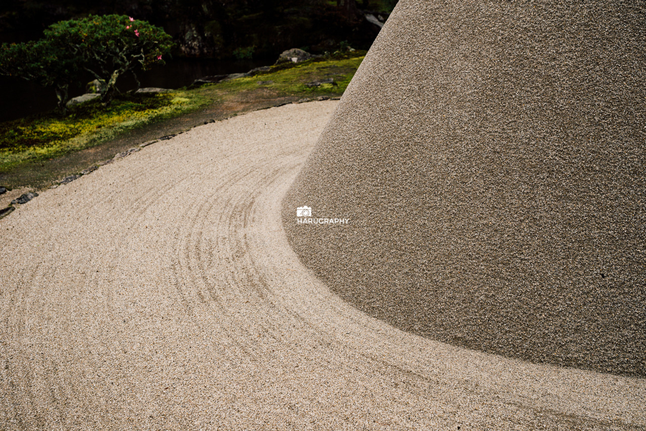 은각사담을 지나 입구를 통과해 경내에 들어가니 작은 가레산스이 정원이 눈 앞에 펼쳐졌다. 가레산스이는 못이나 농업용수 등의 물을 사용하지 않고 돌과 모래 등에 의해 산수의 풍경을 표현하는 정원 양식으로 선종 사상에 영향을 받았다. 「선(禅)」 자체는 형태도 없고 눈에도 보이지 않는다. 선승들은 자신들이 터득한 경지를 상징화하여 형태로 바꾸어 자신을 표현하는 일에 힘썼다고 한다. 이렇게 하여 탄생한 것이 선의 정원 '가레산스이' 다.