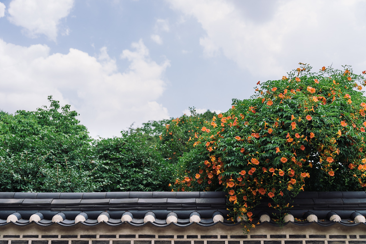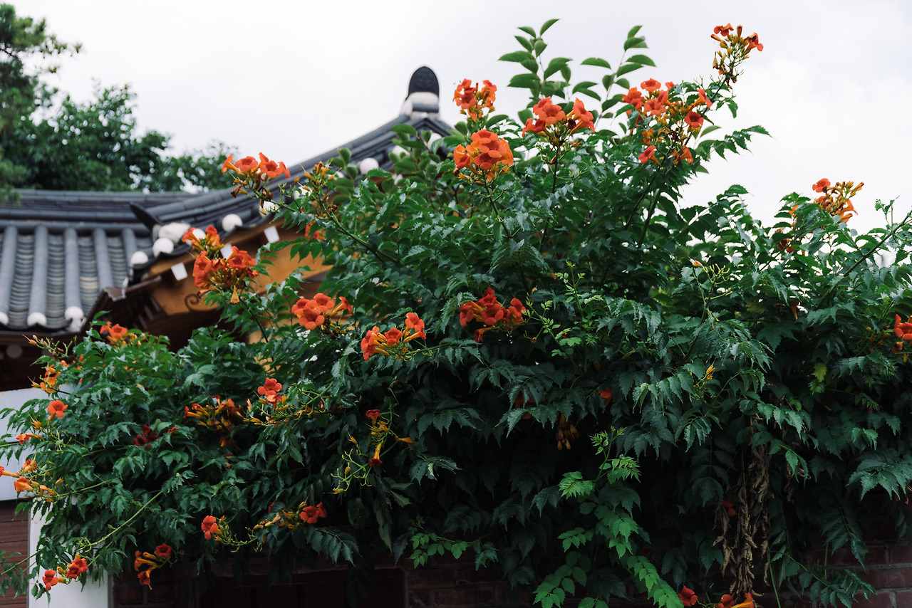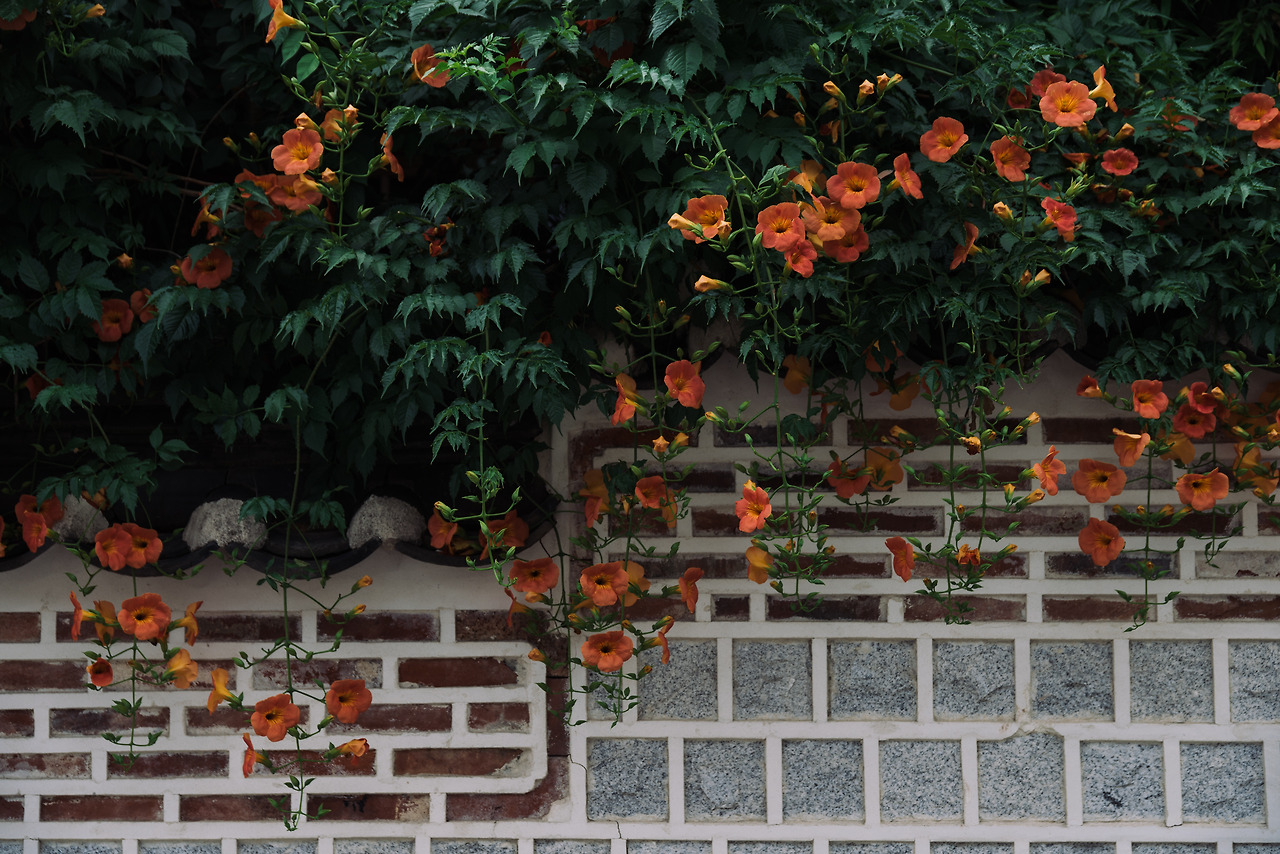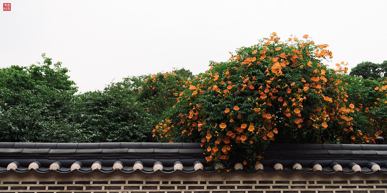 최근에 여름의 신록을 주제로 사진을 찍었는데 며칠 전부터 화사한 꽃이 그리워졌다. 집 근처의 장미도 말라서 떨어지고 배롱나무는 아직 이른 시기인데, 무슨 꽃이 있을까 고민하다가 퍼뜩 능소화가 떠올랐다. 사진 찍는 사람들 사이에서 유명한 대구의 남평문씨본리세거지 같은 장소도 있지만 당일치기로 다녀오기에는 먼 곳이었다. 그런데 생각해보니 서울에도 비슷한 풍경을 볼 수 있는 곳이 있었다. 바로 삼청동의 윤보선길이다. 남평문씨본리세거지처럼 토담은 아니지만 오래된 한옥의 돌담과 능소화가 어우러진 운치 있는 풍경을 가까이에서 만끽할 수 있다.