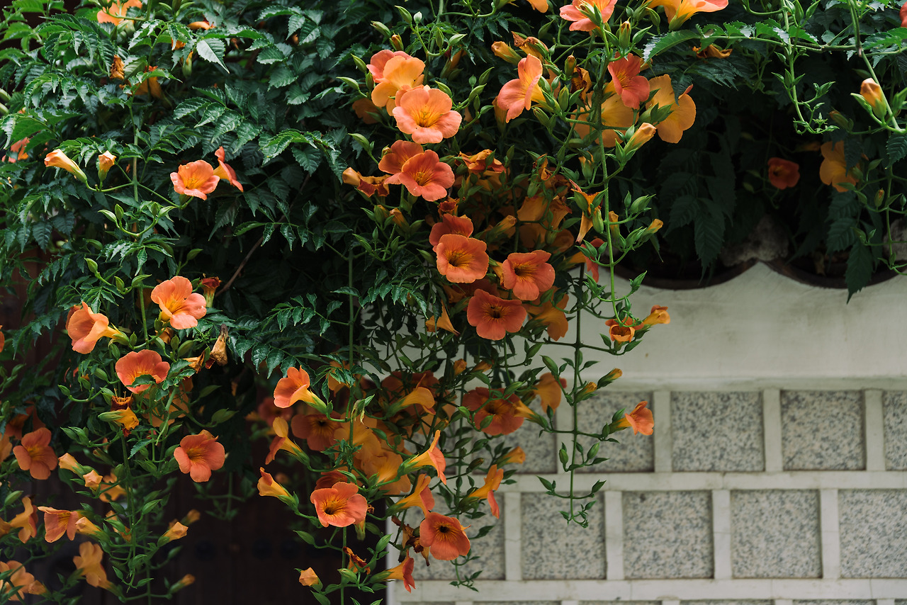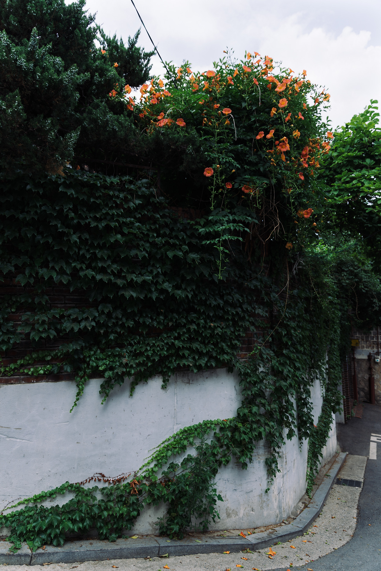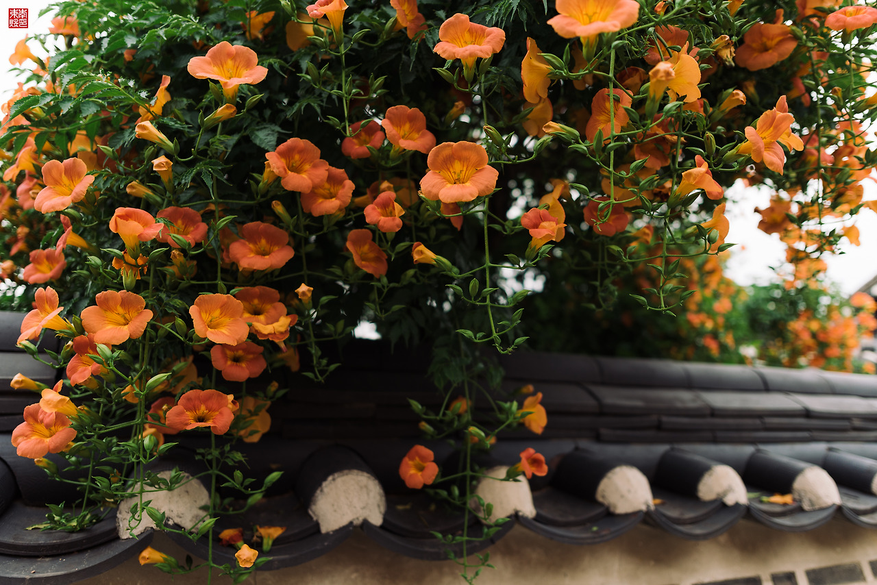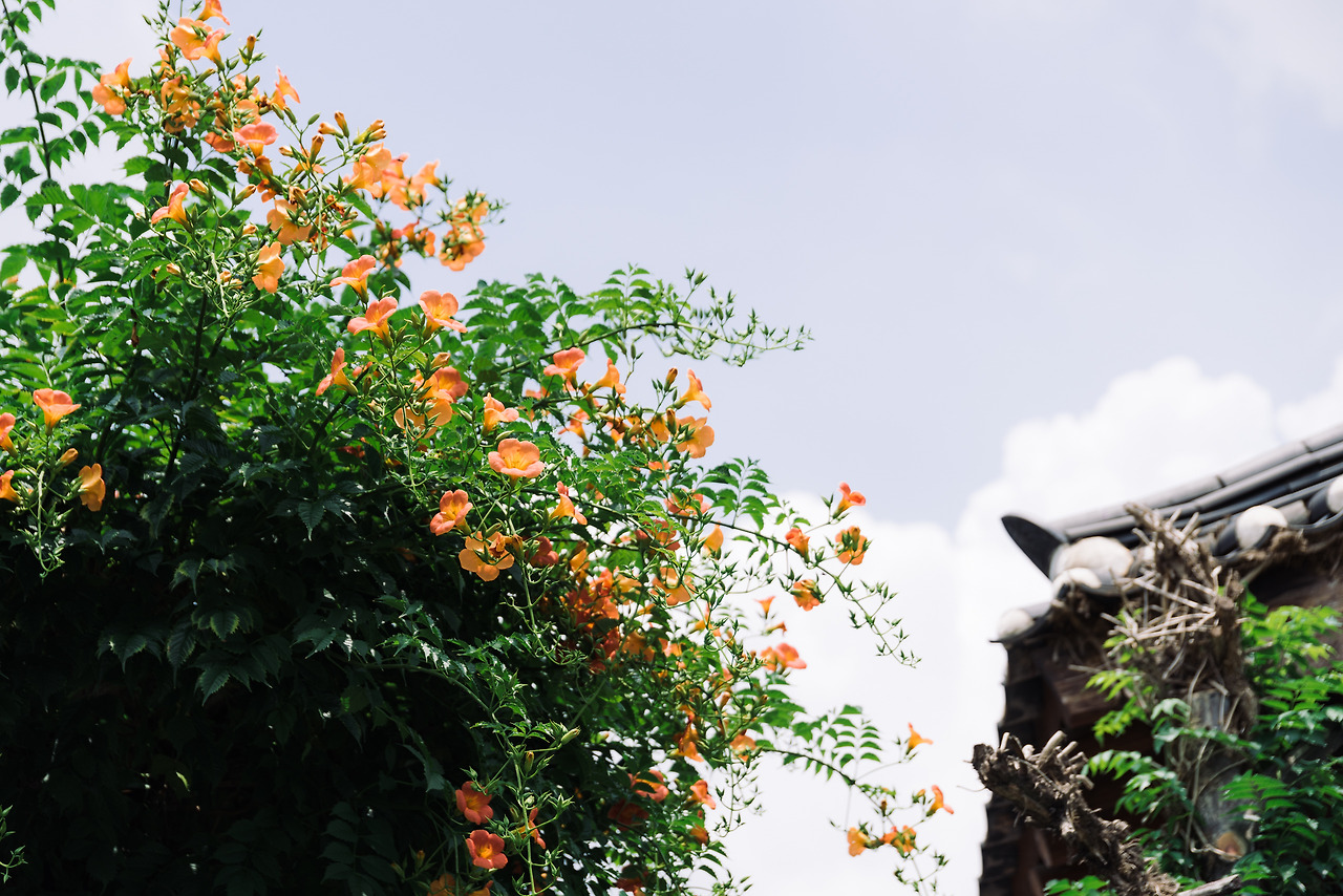 최근에 여름의 신록을 주제로 사진을 찍었는데 며칠 전부터 화사한 꽃이 그리워졌다. 집 근처의 장미도 말라서 떨어지고 배롱나무는 아직 이른 시기인데, 무슨 꽃이 있을까 고민하다가 퍼뜩 능소화가 떠올랐다. 사진 찍는 사람들 사이에서 유명한 대구의 남평문씨본리세거지 같은 장소도 있지만 당일치기로 다녀오기에는 먼 곳이었다. 그런데 생각해보니 서울에도 비슷한 풍경을 볼 수 있는 곳이 있었다. 바로 삼청동의 윤보선길이다. 남평문씨본리세거지처럼 토담은 아니지만 오래된 한옥의 돌담과 능소화가 어우러진 운치 있는 풍경을 가까이에서 만끽할 수 있다.
