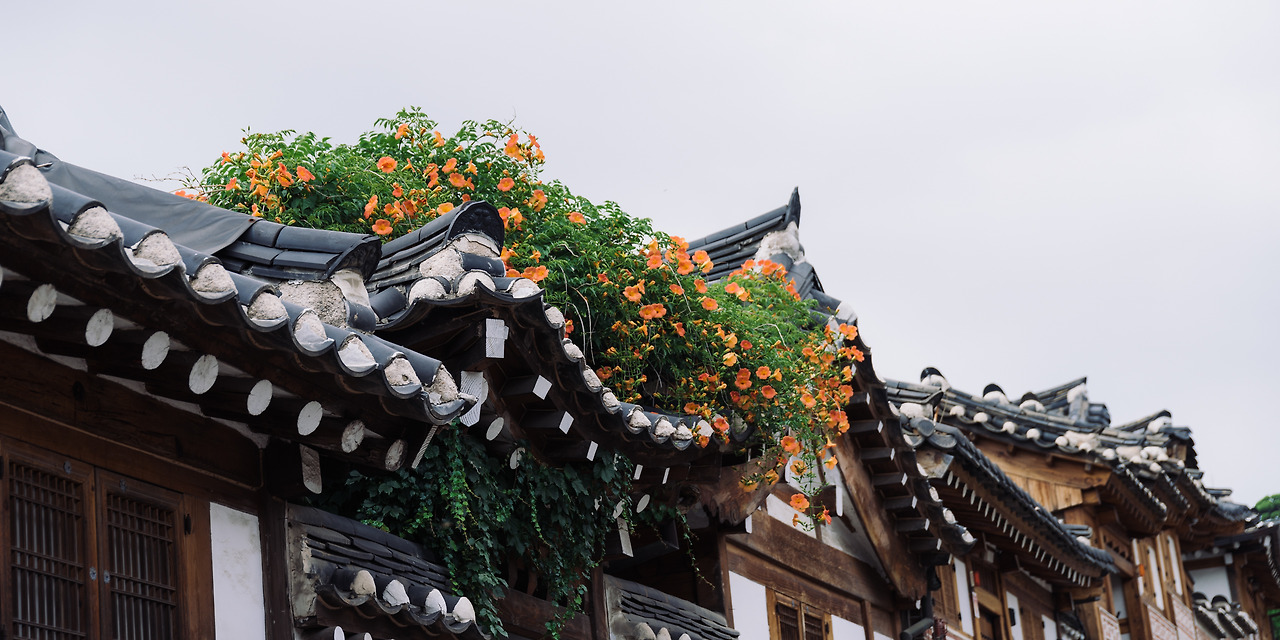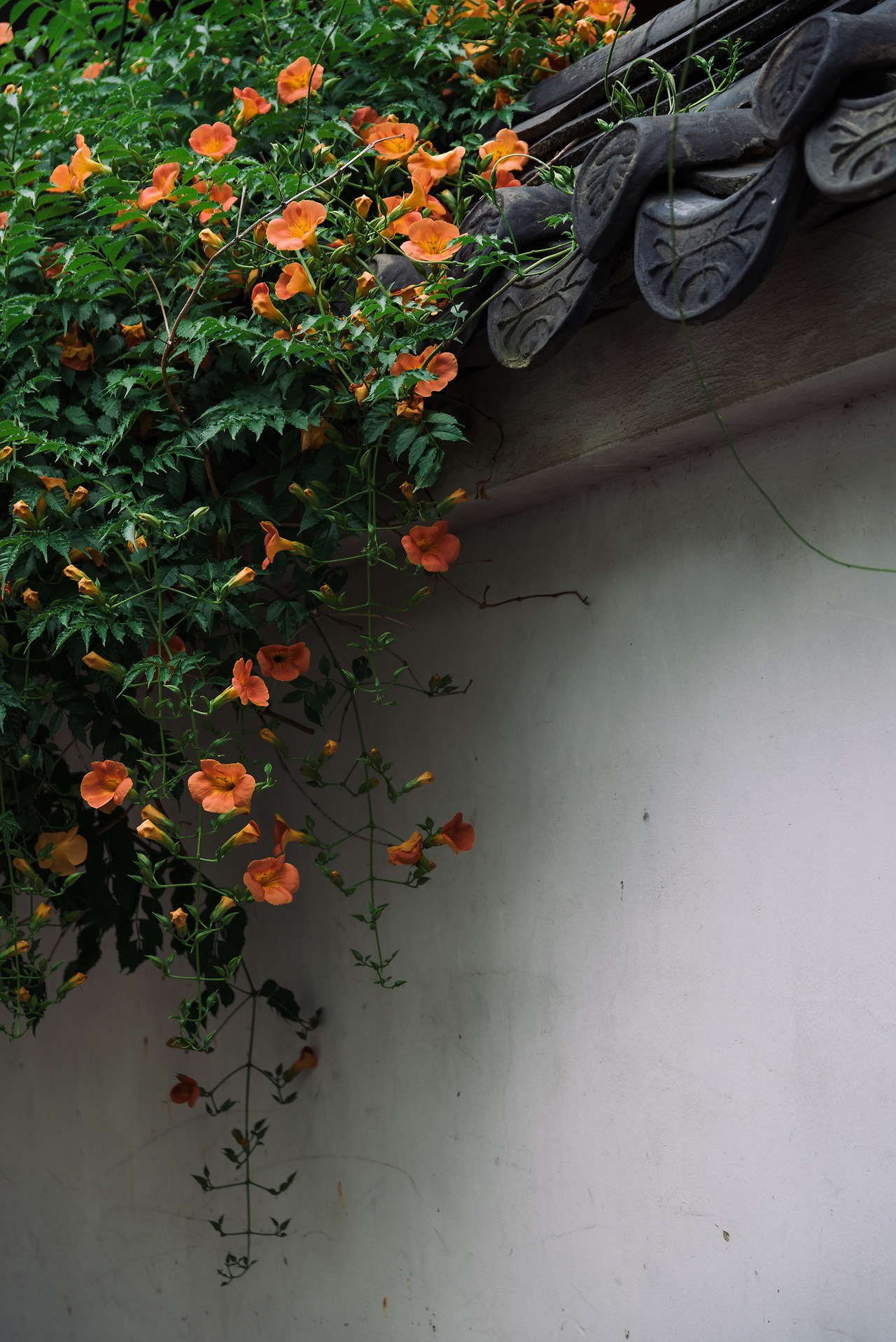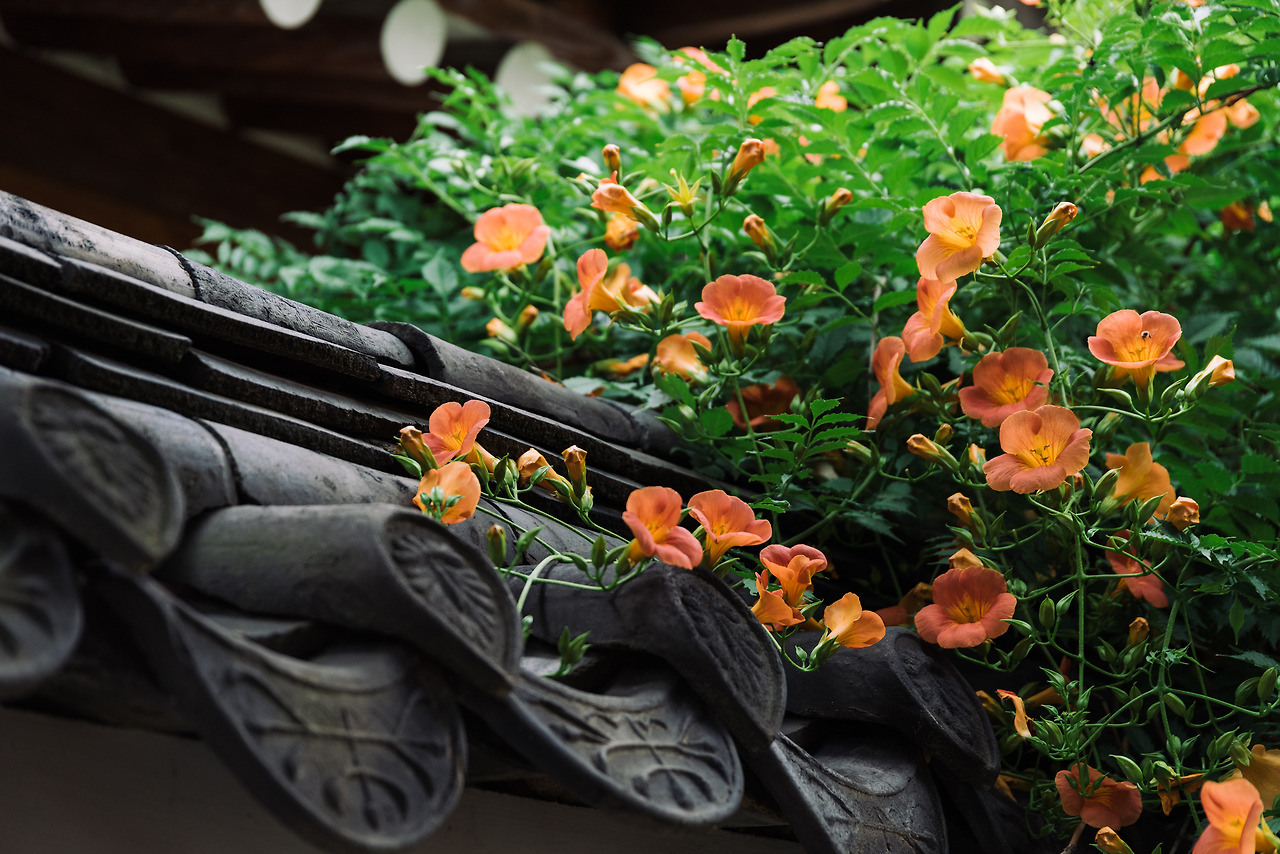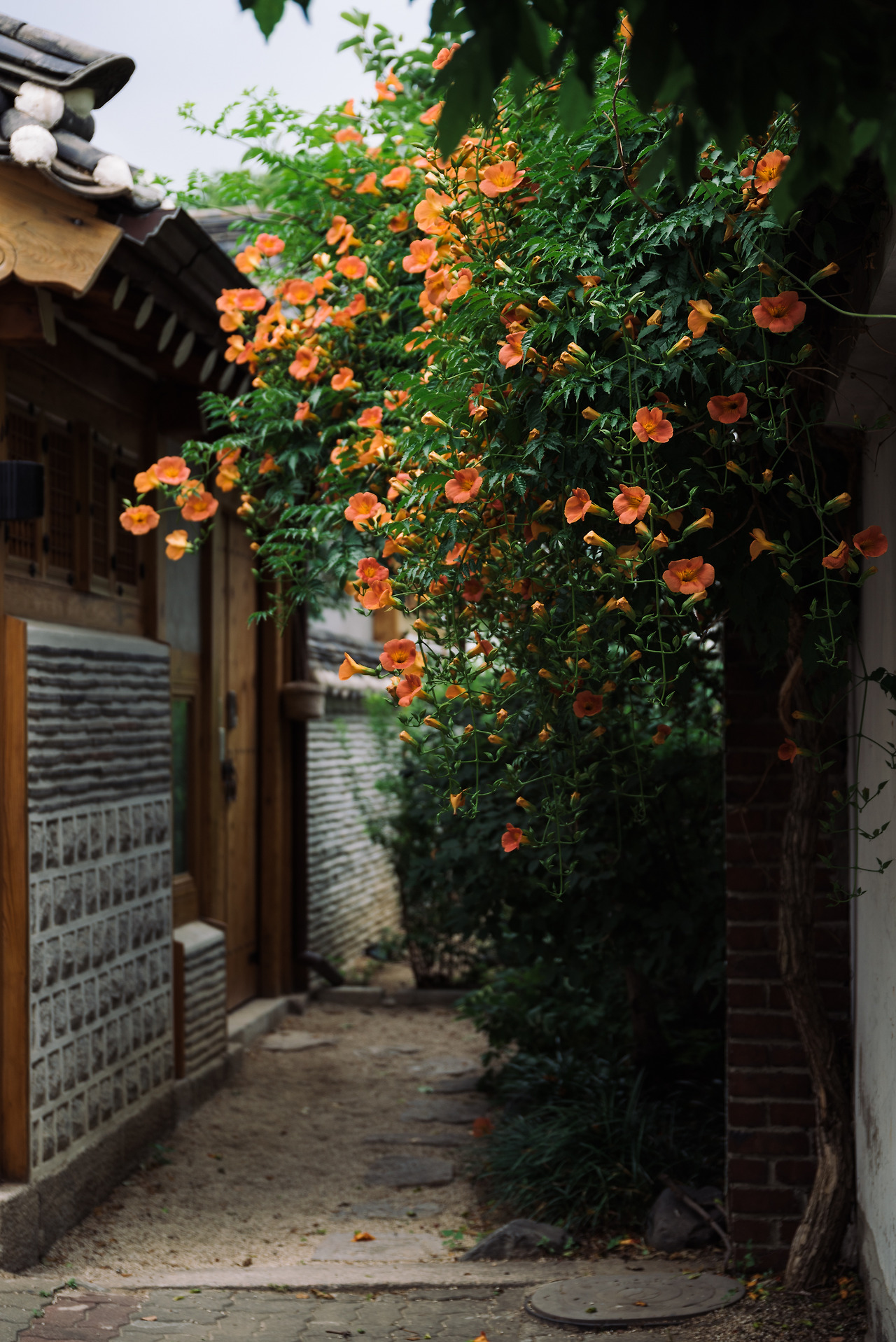 최근에 여름의 신록을 주제로 사진을 찍었는데 며칠 전부터 화사한 꽃이 그리워졌다. 집 근처의 장미도 말라서 떨어지고 배롱나무는 아직 이른 시기인데, 무슨 꽃이 있을까 고민하다가 퍼뜩 능소화가 떠올랐다. 사진 찍는 사람들 사이에서 유명한 대구의 남평문씨본리세거지 같은 장소도 있지만 당일치기로 다녀오기에는 먼 곳이었다. 그런데 생각해보니 서울에도 비슷한 풍경을 볼 수 있는 곳이 있었다. 바로 삼청동의 윤보선길이다. 남평문씨본리세거지처럼 토담은 아니지만 오래된 한옥의 돌담과 능소화가 어우러진 운치 있는 풍경을 가까이에서 만끽할 수 있다.