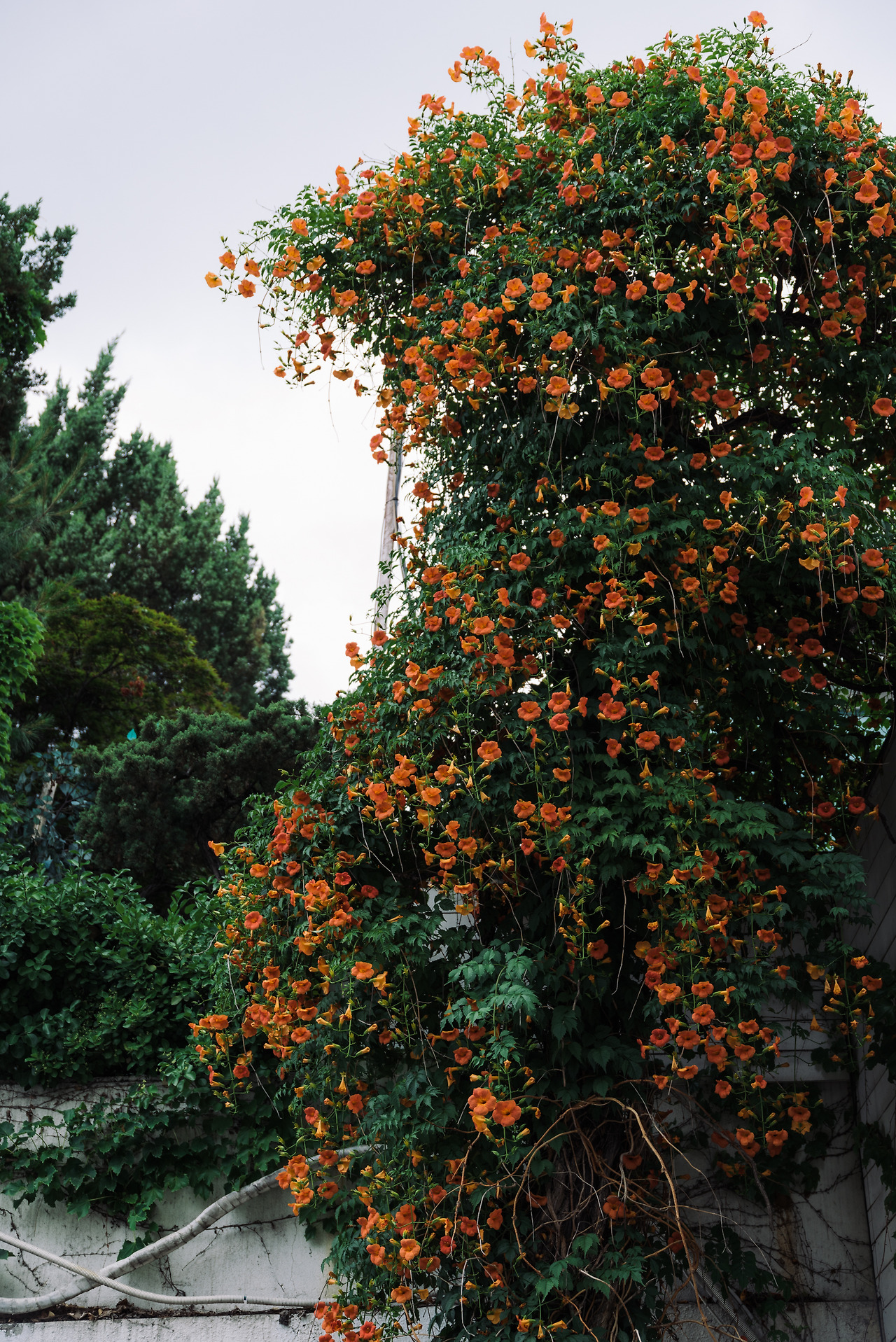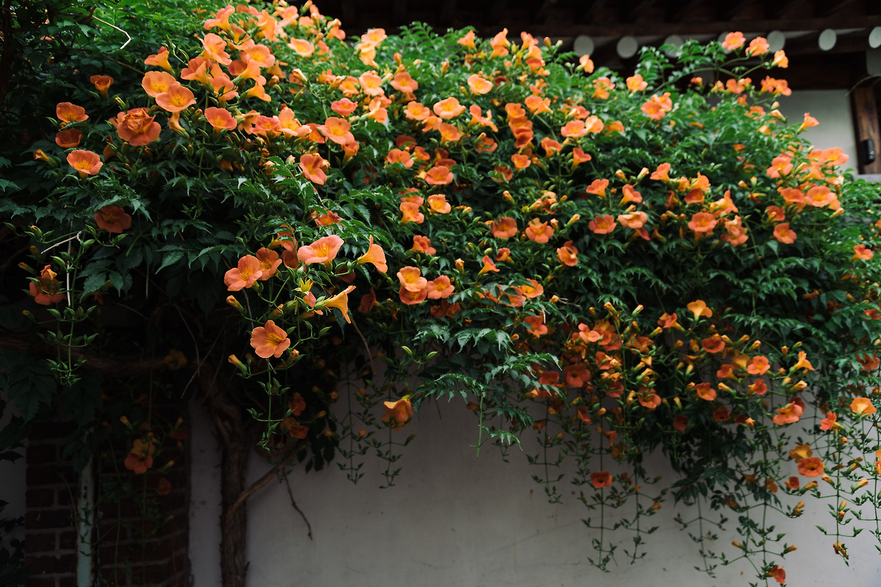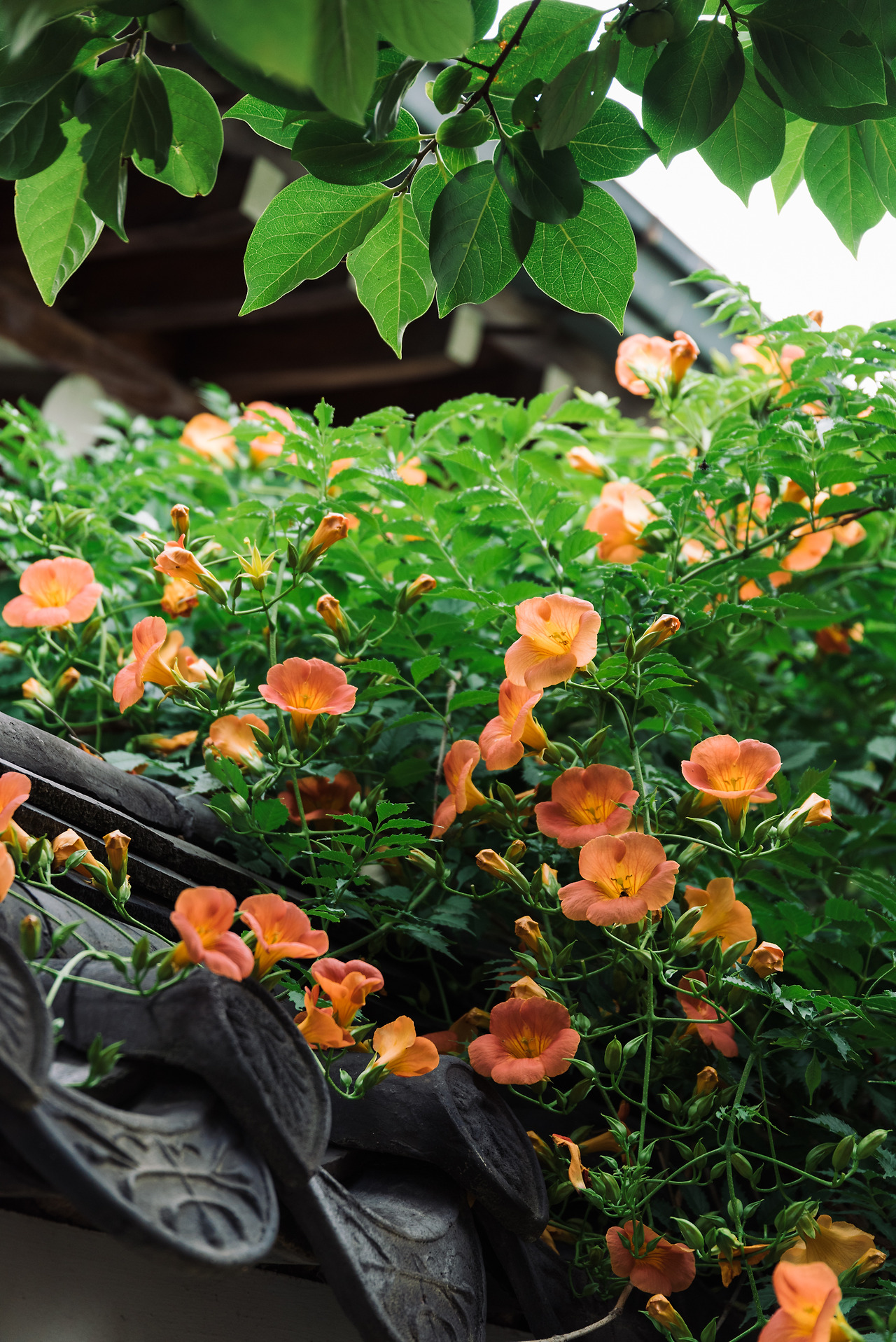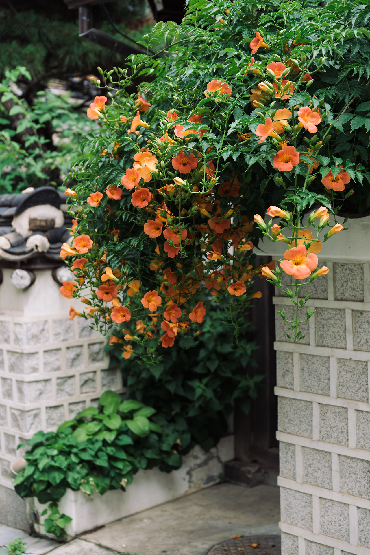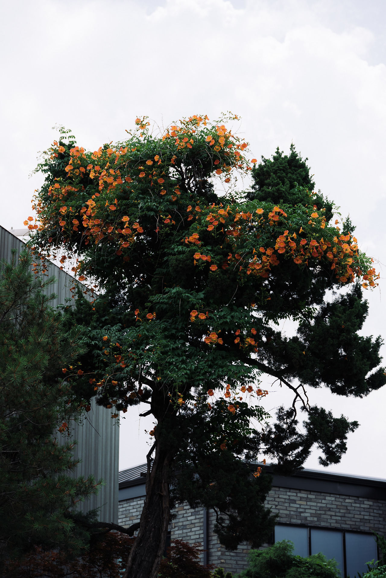 삼청동에 도착하니 잔뜩 찌푸린 하늘에 구름이 흘러가고 있었다. 빛이 부드러워서 편하게 사진을 찍기에 좋았다. 마치 하늘에 있는 거대한 소프트박스를 활용해서 사진을 찍는 기분이랄까. 배경이 깔끔하게 정리되니 능소화의 색과 모양에 더욱 집중할 수 있었다. 윤보선가와 그곳에서 조금 더 걸어가면 나오는 유명한 떡볶이집 앞에 능소화가 활짝 피어 있어서 두 곳을 오가며 즐겁게 촬영했다. 떡볶이집 앞에서 사진을 찍을 때는 예쁜 고양이 한 마리가 프레임 안에 들어오는 행운도 있었다.