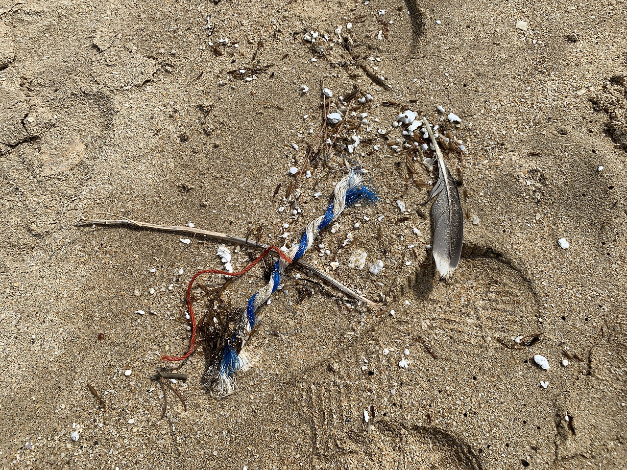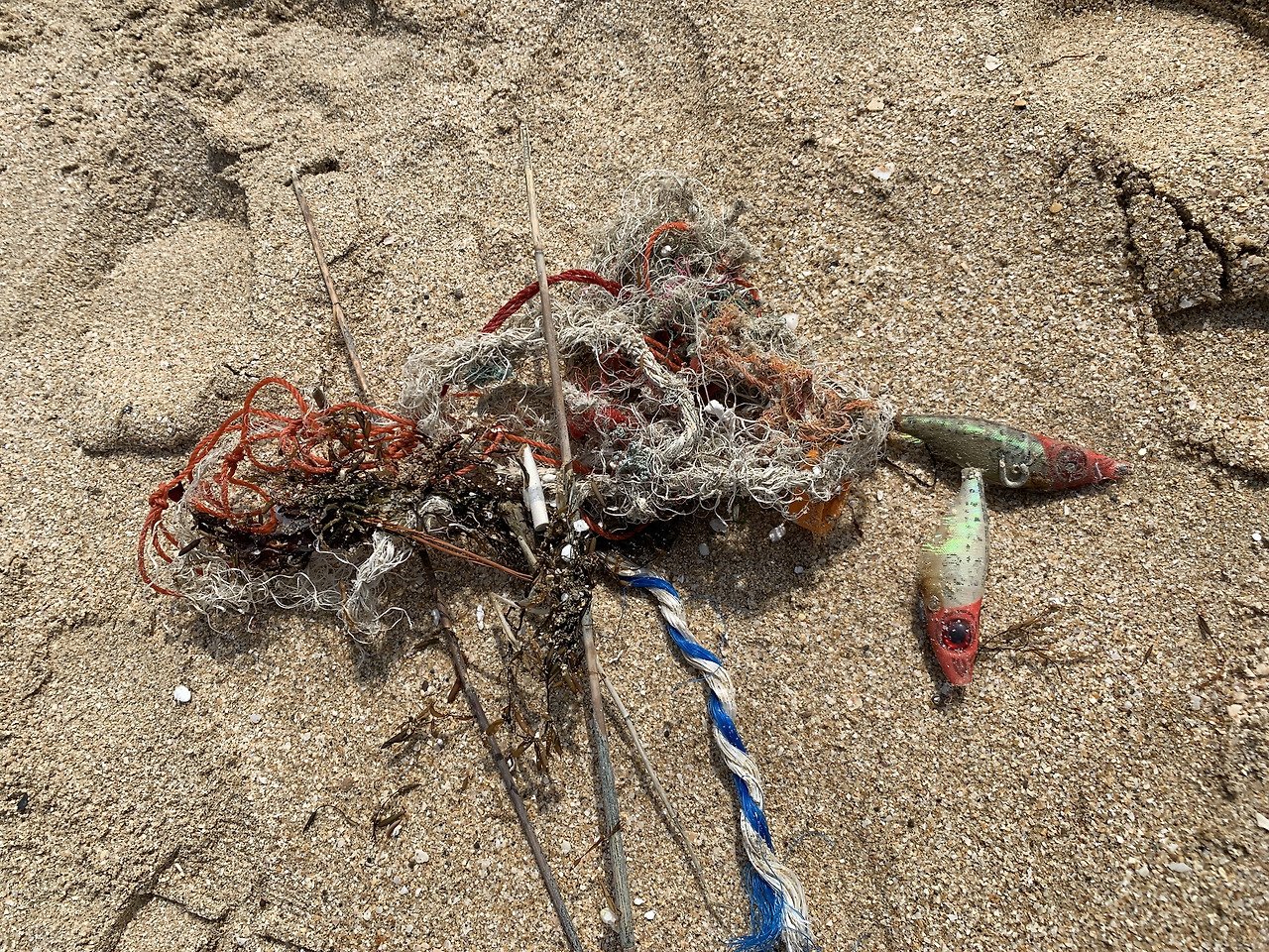 쓰레기가 참 종류별로 많습니다. 플라스틱 장난감이 보입니다. 고무장갑 손가락도 보입니다. 상태를 보니 꽤 많이 삭았습니다. 고무장갑을 버린 사람은 이 손가락이 지금 여기 있을 거라고 상상이나 할까요? 색이 바랜 낚시 미끼는 두 개나 발견했습니다. 유리조각도 단골 바다쓰레기입니다. 그래도 가장 많은 것은 역시 어구와 스티로폼 조각들이었습니다.