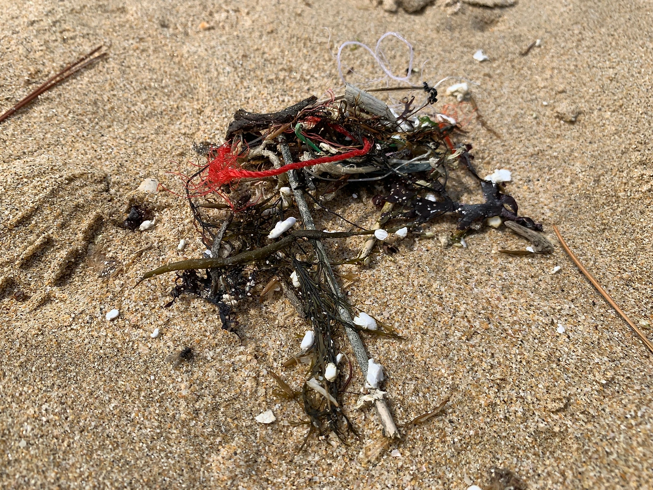 가장 먼저 눈에 들어온 것은 중국에서 떠내려 온 페트병입니다. 바닷가에서 중국 페트병을 여러 번 발견한 이후부터, 바다에 갈 때마다 페트병 쓰레기를 유심히 봅니다. 아마 한국 대부분의 바닷가에 중국에서 온 쓰레기가 이렇게 파묻혀있지 않을까 싶습니다. 언제부터 여기 있었을까요? 그냥 주워다 버렸는데 지금 생각하니 생산일도 살펴볼 걸 그랬습니다. 바다는 돌고 도니 한국산 쓰레기도 바다를 따라 어딘가에 도착해있겠지요.