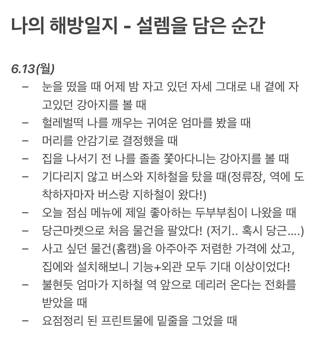 그래서 이옥섭 감독이 한 말처럼 나는 이토록 미운 나를 사랑해보기로 했다. 나를 사랑하기 위해 늪처럼 빠져있는 슬픔에서 잠시 벗어나는 순간들을 기록하기로 마음먹었다. 작중 염미정처럼. 설레는 몇 초들을 모아 숨통 트일 5분을 만들기로 마음먹었다. 순간순간 마주치는 상황의 설렘을 기록한다는 건 또 다른 기쁨이었다. 찰나의 순간, 사소한 무엇들은 나를 슬픔으로 끌어내리기도 하지만. 내가 써 내려간 글의 일부처럼 슬픔과 세트인 행복도 곳곳이 존재한다는 것을 나는 간과했다. 나는 분명 하루에 몇 초, 몇 분은 충분히 행복했다.