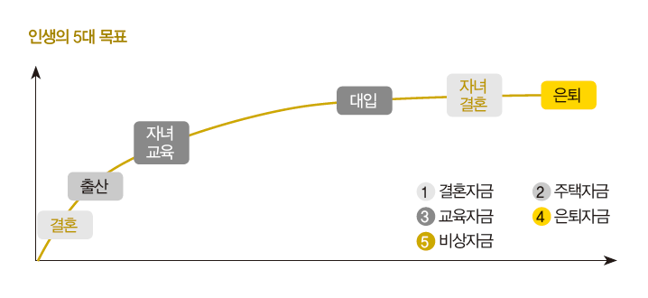 우리가 돈 때문에 난감한 상황에 빠지는 건 결국 ‘필요할 때 필요한 만큼의 돈이 부족하기 때문’입니다. 이것이 기간에 따라 재무설계를 해야 할 이유지요. 앞으로 인생에 닥칠 대형 이벤트인 결혼자금, 자녀교육자금, 주택자금, 비상자금, 노후자금 등 ‘5대 자금’은 나이가 들어감에 따라 순차적으로 필요하게 됩니다.