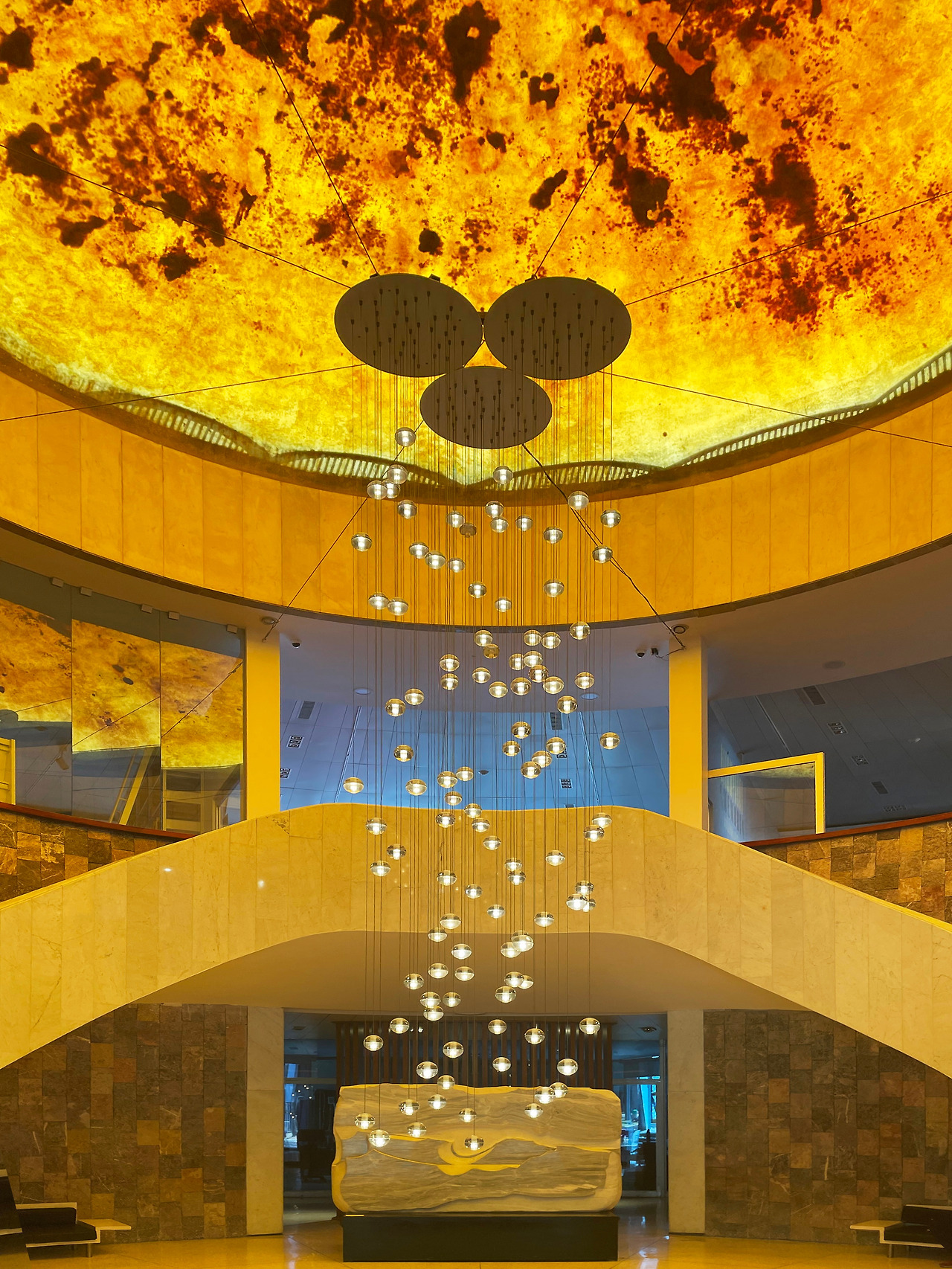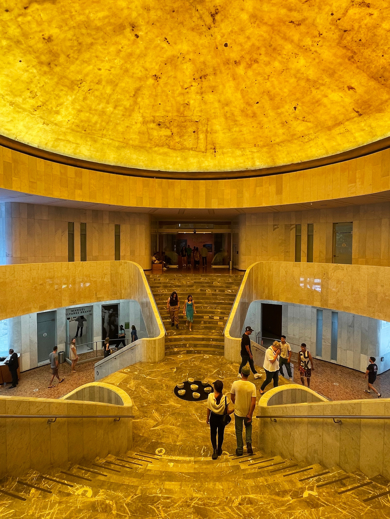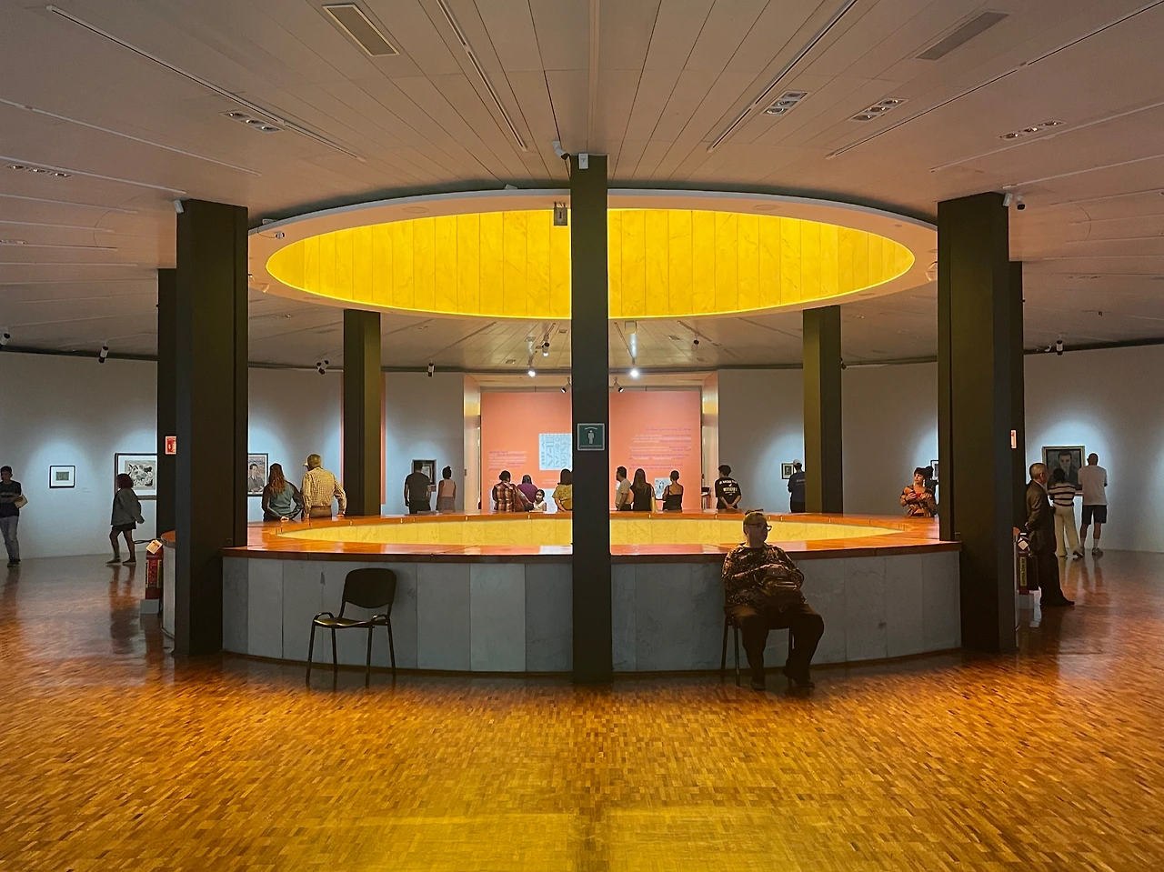 내부에서 전혀 예상치 못한 공간이 나타났다. 입구와 그 뒤로 홀이 위치하였는데, 멋진 계단과 하늘에서 떨어지는 노란빛이 미술관 입장객을 반겨주고 있었다. 원형 홀을 따라 한 바퀴 돌면서 자세히 살펴보았는데, 독특한 계단의 형태는 홀에 멋진 조형감을 불어넣었고, 2층으로 이동하는 동선의 기능을 하며, 반층 아래에 라운지 공간을 만들어냈다. 계단은 그 기능으로도 충분히 의미가 있는데, 조형감과 독특한 공간을 만들어내며 입체적으로 활용되고 있었다. 그리고 계단과 주변 벽 마감이 대리석으로 마감이 되어있어 고풍스럽기도 하고, 세로 방향의 마감을 통해 수평적인 건물에 수직적인 개방감을 주었다. 그리고 홀을 따라 방사형으로 나열된 천장 조명은 홀의 형태를 더욱 부각해 주었다.