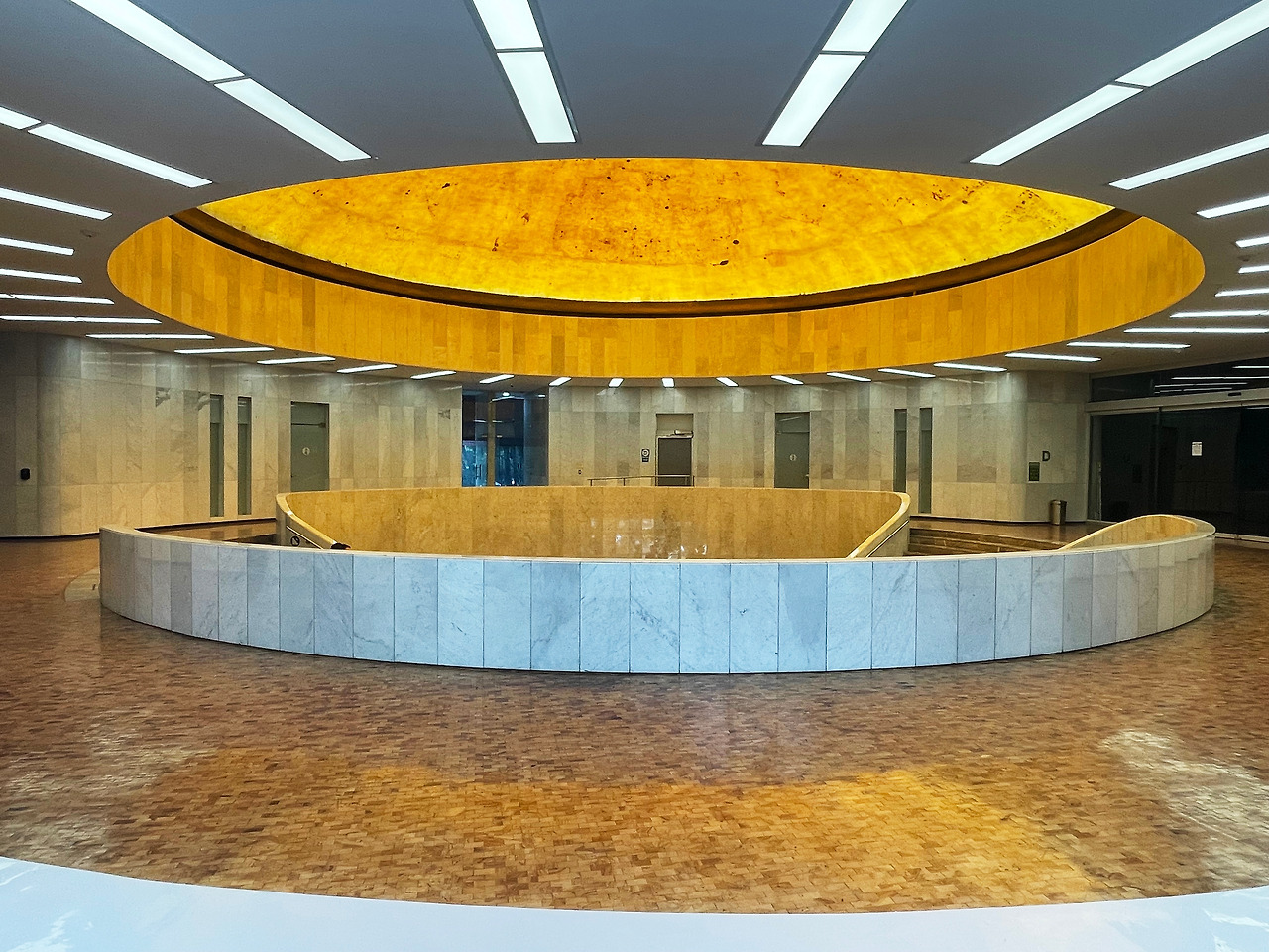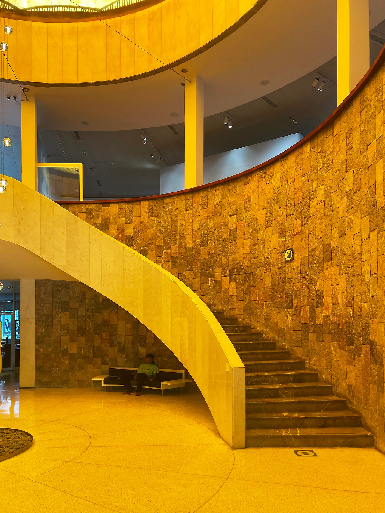 그렇게 살짝 실망한 상태로 건물 주변을 둘러보았다. 개인적으로 유기적인 형태 건물을 망치는 가장 큰 이유가 디테일에 있다고 생각하는데, 자세히 관찰해 보니 국립미술관의 외관이 직선으로 이루어져 있었다. 마치 미분을 하는 것처럼 직선의 연결을 통해 곡선의 모습을 보여주고 있는 것이었다. 물론 이 건물이 60년 전에 지어졌기에 곡선 유리라던가 곡선의 느낌을 더 살리는 디테일이 부족했을지 모르지만, 아쉬움이 느껴졌다. 지금까지 국립 미술관이라는 명성에 비해 진입부터 외관까지 실망의 연속이었지만, 그래도 기대를 품고 내부로 진입하려고 입구 축을 따라 걸어 들어갔다. 점점 가까이 가며 노란빛이 눈길을 끌었다.