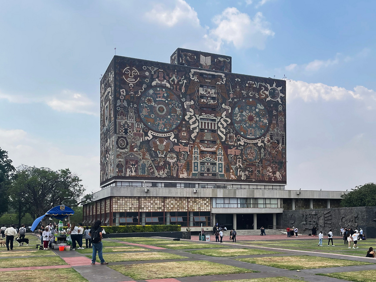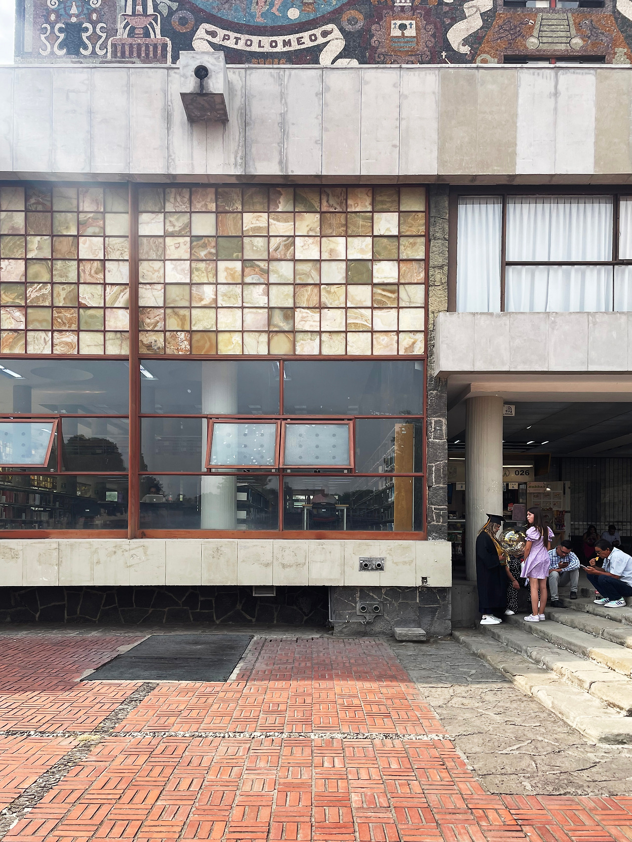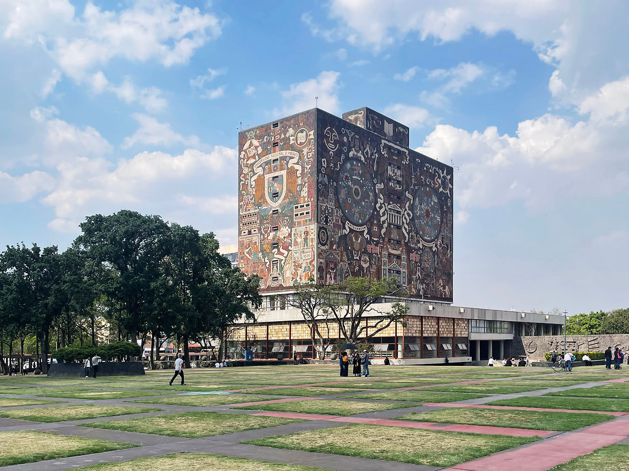 짙은 색감, 섬세하게 그려진 타일 벽화를 살펴보며 도서관을 향해 걸어갔다. 정면, 동측면, 서측면, 배면 모두 멕시코의 특정 시기에 대한 상징과 의미가 있는 벽화이다. 정면에는 식민지 시대의 멕시코를 주제로 스페인의 침략과 그 이후의 사회적 변화를 묘사하고, 동측면에는 현대의 멕시코를 주제로 기술과 산업화가 가져온 변화를 묘사하고 있다. 서측면에는 우남 대학교 및 멕시고 교육과 학문적 성취에 대한 기대를 표현하고, 배면에는 프리히스패닉 시대의 멕시코를 주제로 고대 문명과 그 상징을 그렸다. 즉, 프리히스패닉 시대, 히스패닉 시대, 현대, 그리고 교육이라는 주제를 건물에 투영하여 상징적으로 나타낸 것이다. 설명을 찾아보고 간 터라 각 면의 차이점을 살펴보며 건물을 한 바퀴 둘러보았다. 가는 날이 졸업식을 하는 날이어서인지 도서관 앞에 학사모를 쓴 학생이 정말 많이 있었다. 도서관 앞에 드넓은 잔디밭 광장에서 삼삼오오 사진을 찍는 모습을 보며 이 건물이 우남대학교 학생들에게 상징적인 장소라는 것을 다시 한번 느낄 수 있었다.