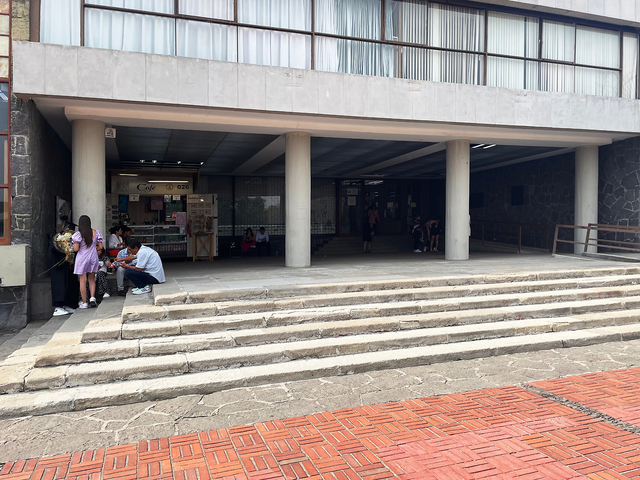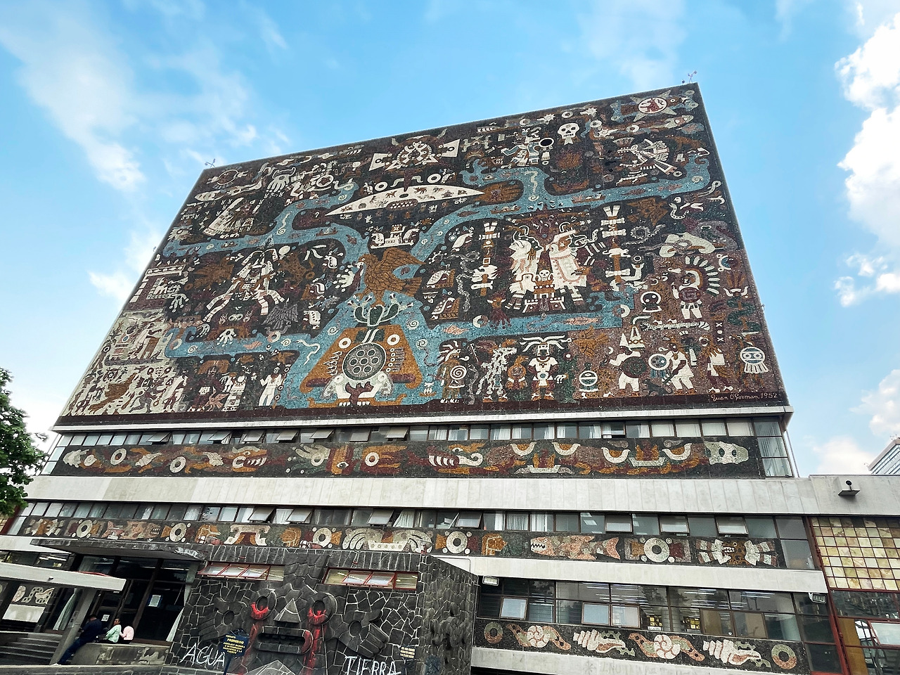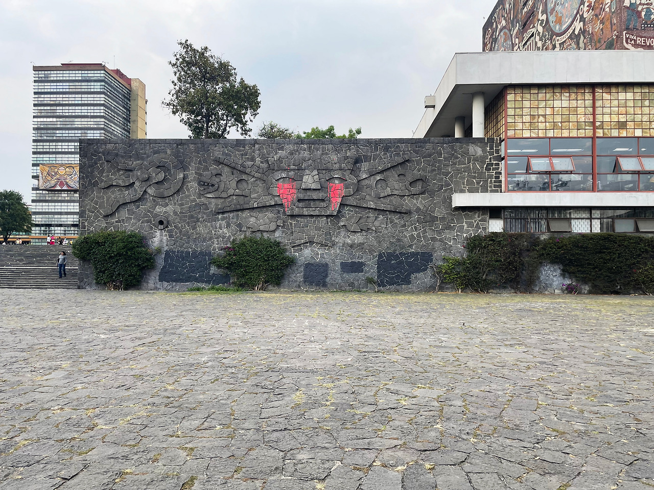 짙은 색감, 섬세하게 그려진 타일 벽화를 살펴보며 도서관을 향해 걸어갔다. 정면, 동측면, 서측면, 배면 모두 멕시코의 특정 시기에 대한 상징과 의미가 있는 벽화이다. 정면에는 식민지 시대의 멕시코를 주제로 스페인의 침략과 그 이후의 사회적 변화를 묘사하고, 동측면에는 현대의 멕시코를 주제로 기술과 산업화가 가져온 변화를 묘사하고 있다. 서측면에는 우남 대학교 및 멕시고 교육과 학문적 성취에 대한 기대를 표현하고, 배면에는 프리히스패닉 시대의 멕시코를 주제로 고대 문명과 그 상징을 그렸다. 즉, 프리히스패닉 시대, 히스패닉 시대, 현대, 그리고 교육이라는 주제를 건물에 투영하여 상징적으로 나타낸 것이다. 설명을 찾아보고 간 터라 각 면의 차이점을 살펴보며 건물을 한 바퀴 둘러보았다. 가는 날이 졸업식을 하는 날이어서인지 도서관 앞에 학사모를 쓴 학생이 정말 많이 있었다. 도서관 앞에 드넓은 잔디밭 광장에서 삼삼오오 사진을 찍는 모습을 보며 이 건물이 우남대학교 학생들에게 상징적인 장소라는 것을 다시 한번 느낄 수 있었다.