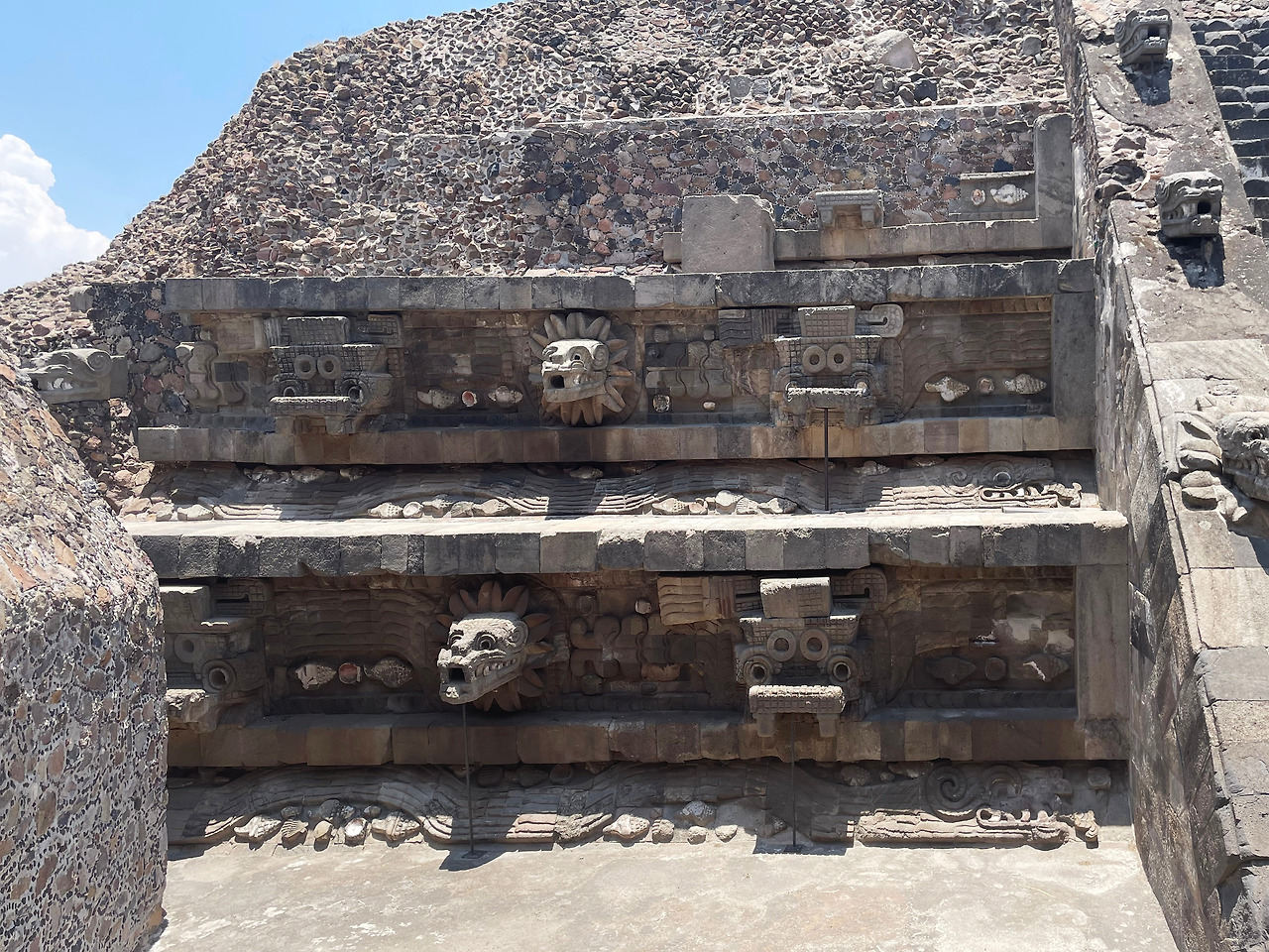박물관에서 나와 케찰코아틀 신전으로 이동했다. 이 신전은 규모로 따지면 태양 및 달 피라미드보다 작지만, 후세에 미친 영향으로는 가장 중요한 신이자 제단이다. 케찰코아틀은 "깃털 달린 뱀"을 의미하고, 하늘과 창조의 신으로 여겨졌다. 이 신은 고대부터 메소아메리카의 중요한 상징으로 아즈텍 신화에까지 이어졌다. 실제로 신전을 가보니 태양의 피라미드에는 없던 상징이 돌로 표현되어 있었다. 계단과 단의 입면에 조각되어 있기에 자세히 관찰할 수 있었다. 태양과 달이라는 아닌 우주적 존재도 있지만, 용이나 유니콘 같이 현실에 존재하지 않지만 현실에 있을법한 동물의 조합을 통해 만들어진 신은 인류 전체가 공통적으로 할 수 있는 상상이었던 것 같다. 그리고 케찰코아틀 신전은 낮지만 유일하게 올라갈 수 있는 피라미드였기에 계단을 따라 올라갔다. 생각보다 경사가 높고 디딤판이 좁아서 오르내리기가 무서웠다. 그래도 위에 올라가서 고대 도시 모형에서 보았던 것처럼 사람과 집이 있다면 정말 신과 마주할 수 있을 것 같은 느낌이 들 것 같았다.