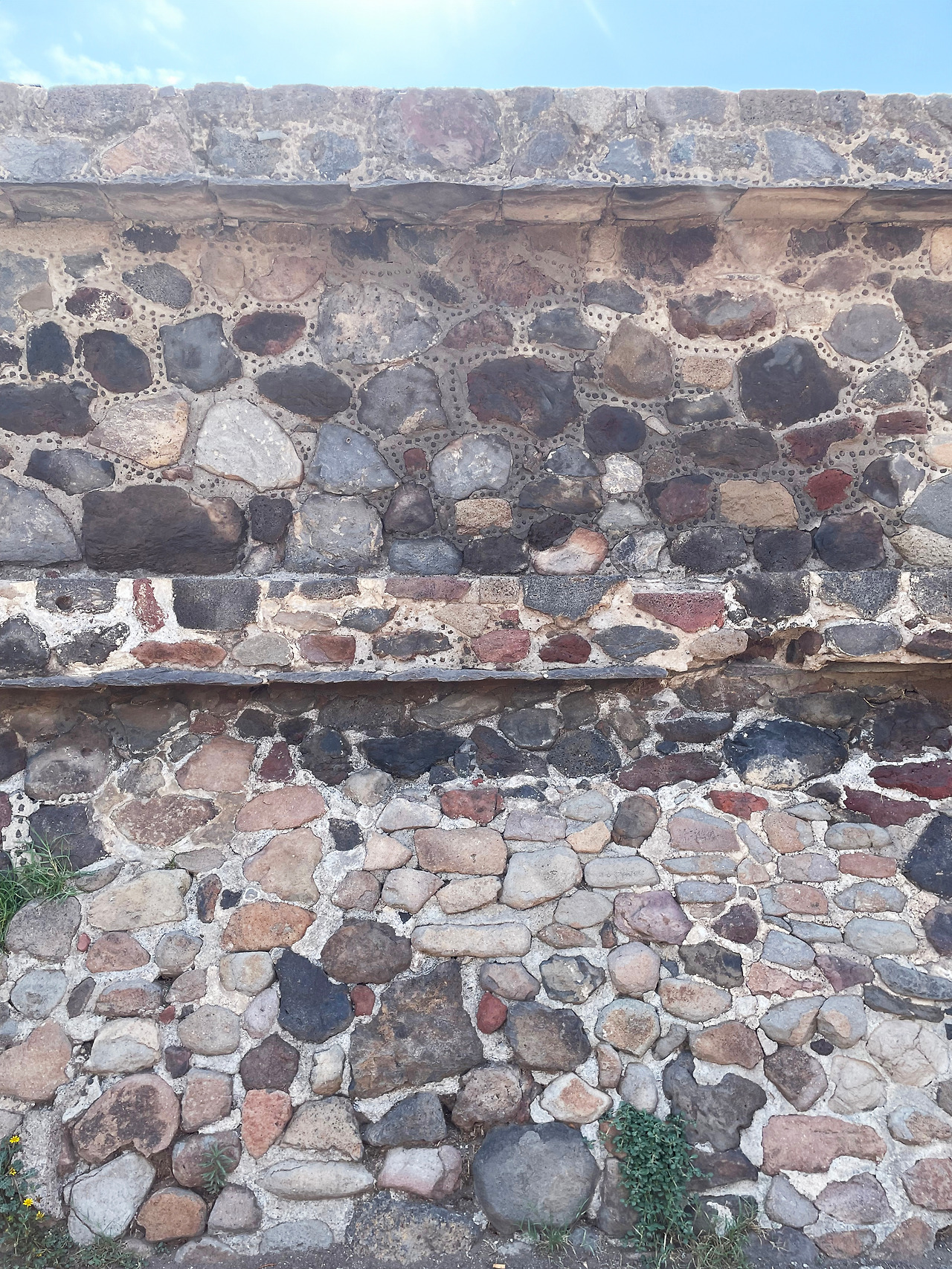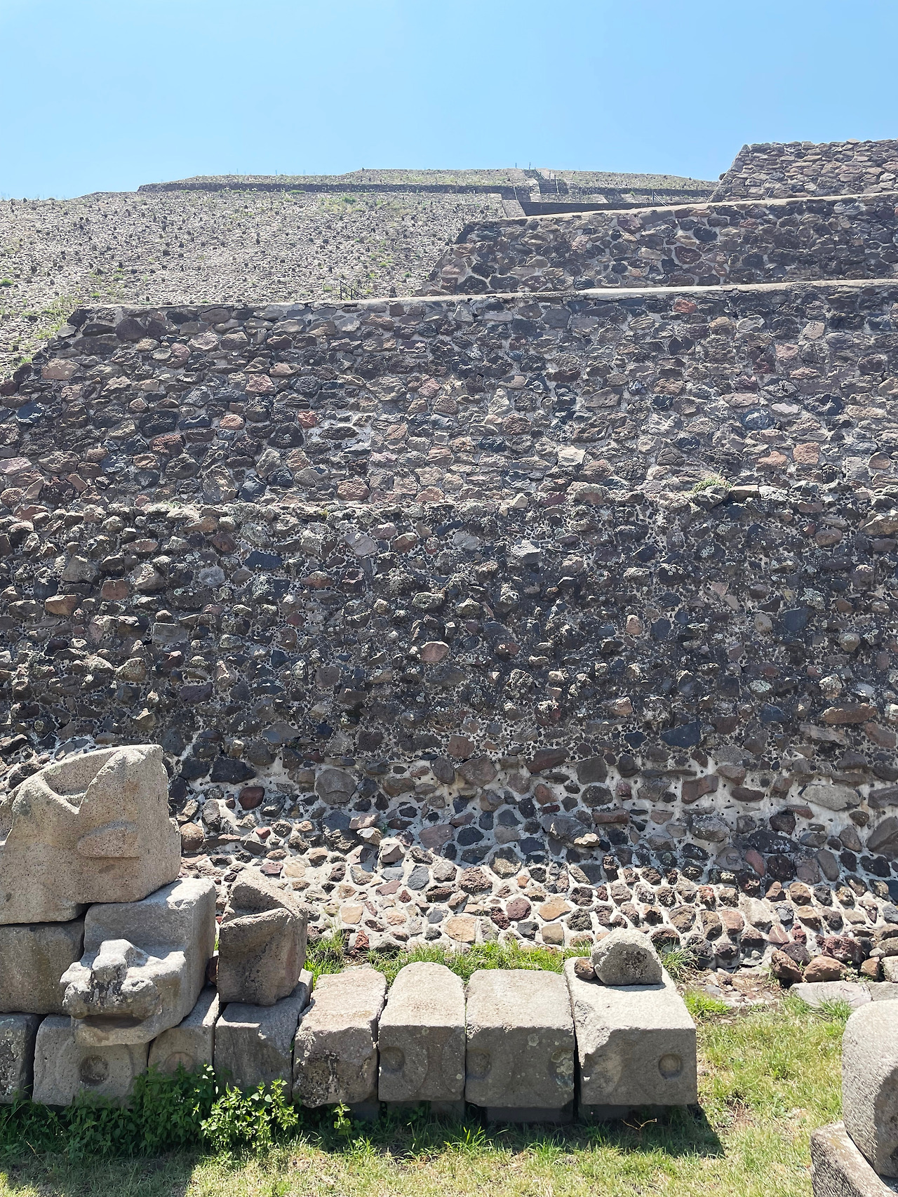 정면을 구경한 후, 제단과 피라미드 기단부 한 바퀴를 돌아보았다. 피라미드의 거대함에 계속 놀라면서 동시에 다른 면에 부계단이 있을까 궁금해하면서 살펴보았는데, 정면을 제외한 세 면에는 계단이 없었다. 둘러보다가 놀란 점은 생각보다 작은 돌들이 쌓여 피라미드가 구축된 점이었다. 멀리서 피라미드를 보았을 때 하나의 깔끔한 덩어리가 아니라 작은 점들이 아주 많이 보여서 의아했었는데, 그 이유가 작은 돌들이 쌓여서 만들어졌기 때문이었다. 피라미드를 쌓은 돌이라고 하면 사람 몇 명의 크기를 가진 크기일 것이라는 예상과 달리 사람 몸통보다 작은 돌이 쌓여있었다. 작은 돌들이 쌓여서 만들어진 멕시코 피라미드는 마치 벽돌을 쌓아 만든 집과 같이 작은 것들이 모여 반복적으로 만들어내는 아름다움을 보여주고 있었다. 이를 조금 확장해 보면, 우리가 건물을 보고 느끼는 추상적인 이미지는 실제로 건물을 구축하는 재료, 구조 등의 물리적 결과물이라는 사실을 다시 한번 강하게 느낄 수 있었다.