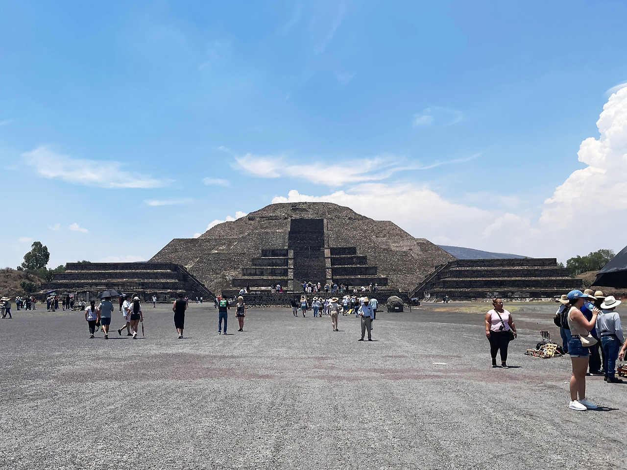 케찰코아틀 신전을 둘러보고 나서 마지막으로 달의 피라미드로 향했다. 케찰코아틀은 가장 남쪽에, 달 피라미드는 가장 북쪽에 있었고 그 거리는 2km가 넘어서 30분을 걸었다. 아주 긴 축은 죽은 자의 길(Avenue of the Dead)이라 불리며 도시의 가장 중요한 길이었고, 도로 양쪽으로 집이 즐비했을 것으로 추정된다. 멀리서 달 피라미드가 보였고, 그 규모는 150 x 150m, 높이가 45m에 달했다. 여전히 달 피라미드도 중심에 계단과 제단이 놓여있었지만, 태양의 피라미드에 비해 양쪽에 부속 건물이 더 많았다. 태양의 피라미드에는 중요한 기념일에 제사를 드렸다면, 달의 피라미드에는 더 자주 제사를 드렸기에 부속 건물이 많이 필요하지 않았을까라는 개인적인 추측을 해보았다. 멕시코 피라미드가 이집트 피라미드보다 순수한 조형적인 형태를 보여주지 못하고 있었기에 오히려 달 피라미드의 다양한 부속건물과의 관계를 보여주는 이 건물에 더 애정이 갔다. 그리고 크기도 과하게 크지 않아서 편안한 마음도 있었다.