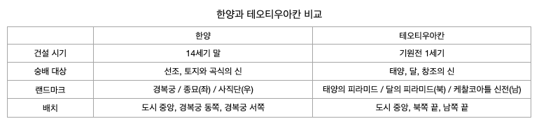 물론 건설 시기, 숭배 대상, 랜드마크 배치, 형태 등은 문화에 따라 다른 모습을 보여주었다. 하지만 근대 이전(종교가 과학과 분리되기 이전)에 종교건물은 도시민을 하나로 묶어주는 중요한 요소이자 랜드마크였던 것은 많은 문화에서 나타나는 공통점이다. 정도전은 한양을 건설하며 좌묘우사로, 테오티우아칸 계획가는 남쪽으로 케찰코아틀, 북쪽으로 달의 피라미드를 배치하며 테오티우아칸을 건설하였다. 즉 세대와 지역을 넘어서서 도시계획가는 랜드마크를 통해 도시 전체를 디자인하였고, 지금도 그 방향성은 유지되고 있었다. 이러한 생각이 이어지며 나와는 전혀 상관없던 테오티우아칸이 인류의 보편적 태도를 담고 있는 문명으로 느껴지기 시작했다. 시간적, 공간적 한계를 넘어선 보편성은 '단순히 같은 지역에 살았던 선조가 아니더라도 인간으로서 같은 감정을 느낄 수 있는 지점이 아닐까' 하는 생각을 하며 답사를 마무리하였다.