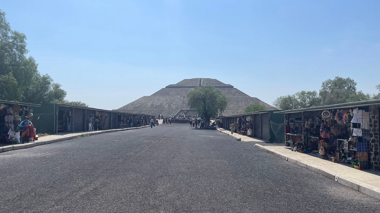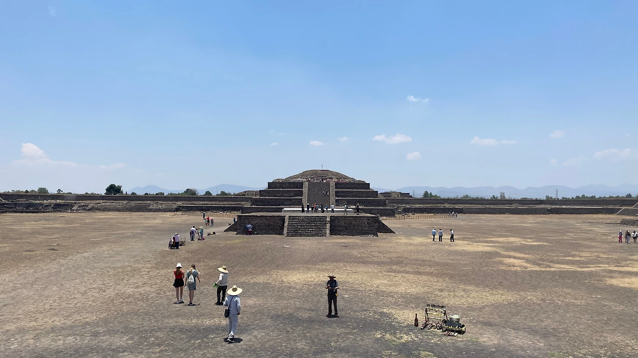 테오티우아칸은 멕시코 시티 시내에서 50km 떨어져 있기에 북부 터미널에서 시외버스를 타고 1시간 정도 가야 도착할 수 있다. 워낙 유명한 관광지기에 관광객도 많이 있고, 버스도 자주 있어서 가는 길은 크게 어렵지 않다. 버스에서 내려서 티켓을 구매한 후 입장하니 긴 축을 따라 피라미드가 보였다. 축을 중심으로 양 옆으로는 상점이 길게 자리 잡고 있으면서 작은 기념품이나 마실 것을 팔고 있었다. 커다란 피라미드를 향해 15분 정도 넘게 걸어서 도착한 것을 생각해 보면, 그 거대함을 느낄 수 있었다.
