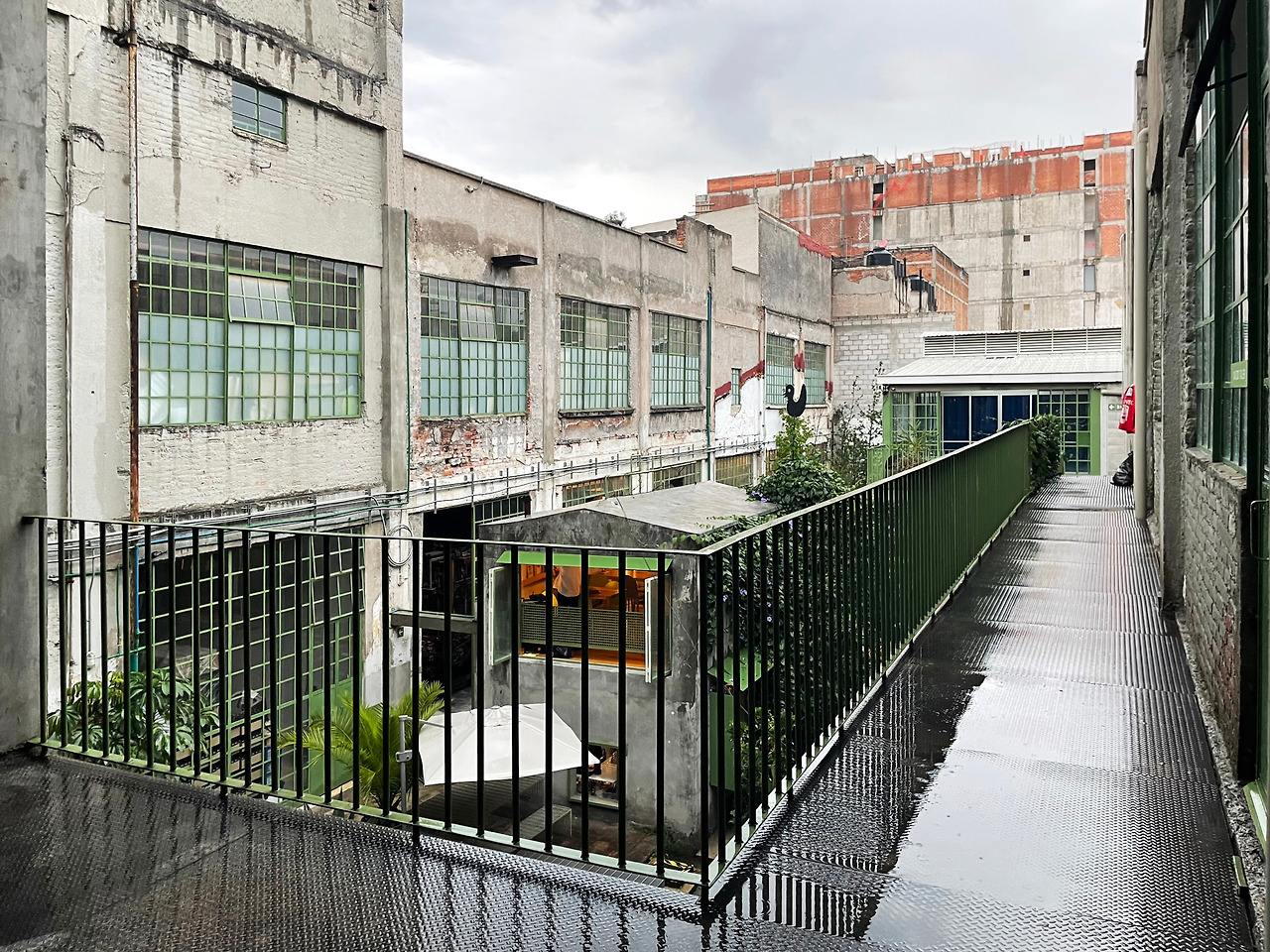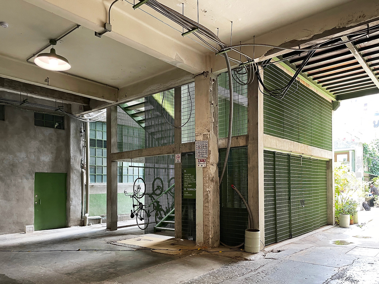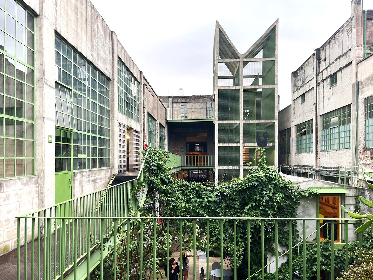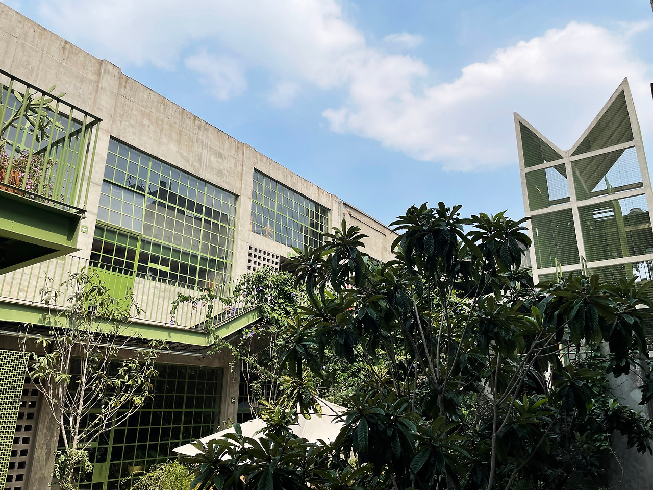 구역 1을 둘러보고 구역 2로 이동하며 마주친 메인 중정에서 건축가의 디자인 의도를 이해할 수 있었다. 메인 중정에는 여러 식재가 계획되어 있었고, 건물 양쪽을 연결할 정도로 풍성한 덩굴이 시선을 사로잡았다. 그리고 식재와 함께 보이는 중정은 건축과 조경이 조화를 이루는 풍경이었다. 이 과정에서 건축에 스며든 올리브 색상은 조경과 하나 되는 색상이었다. 건축가는 공장 건물에 조경 계획과 함께 건물 일부에 올리브 색을 칠함으로써 기존 공장의 삭막함에서 탈피하여 친근하고 자연적인 분위기를 연출한 것이었다. 또한 건축가는 벽, 기둥, 보와 같은 건축의 핵심 구성요소는 철근 콘크리트를 그대로 노출하며 기존 공장의 거친 모습을 유지하였고, 창틀, 문, 난간과 같은 부차적인 요소에는 올리브 색을 칠하여 현대적인 감각을 녹여냈다. 이러한 두 가지 시간이 공존하는 모습은 리모델링 프로젝트에서만 느낄 수 있는 독특한 감각이었다. 중정은 작은 카페를 중심으로 벤치가 놓여 있어서 사람들이 삼삼오오 모일 수 있기에 커뮤니티 공간으로서 기능하고 있었다. 평일에는 여러 사무소 직원들이 나와서 회의를 하거나 휴식을 취하는 공간이고, 주말에는 야외 카페로 활용되었다. 내가 답사한 여러 멕시코 건물, 특히 오피스 건물은 공원까지 나가지 않고도 잘 계획된 정원이나 중정을 통해 풍요로운 공간을 향유하고 있었다. 확실히 멕시코인들의 조경 디자인과 공용 공간에 대한 감각은 우리와 무척 다르다고 느껴졌다.