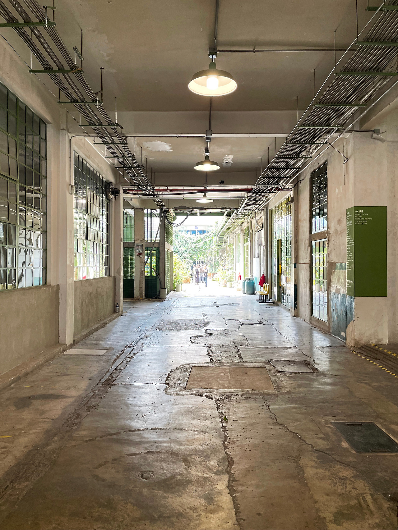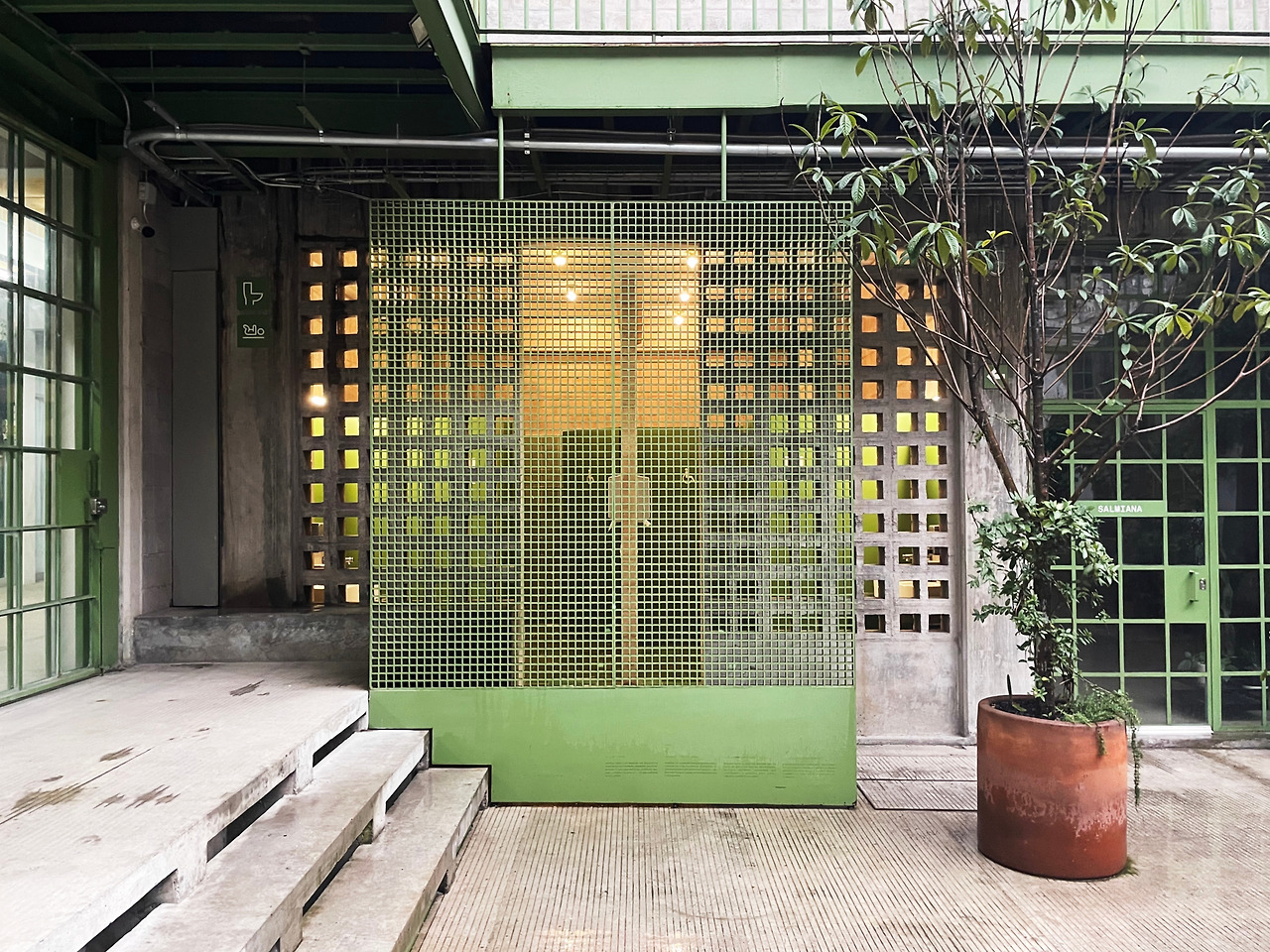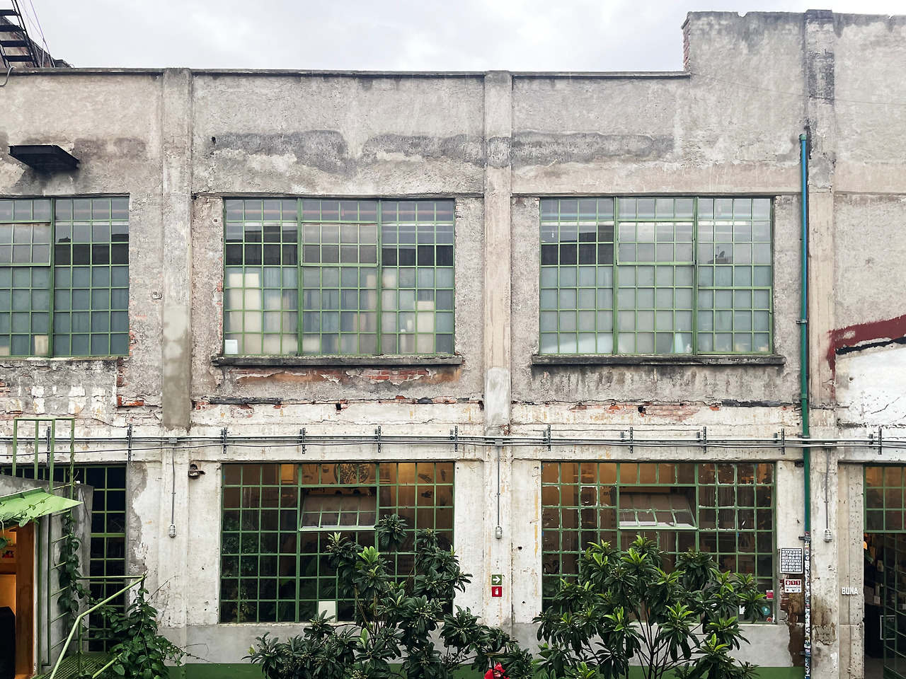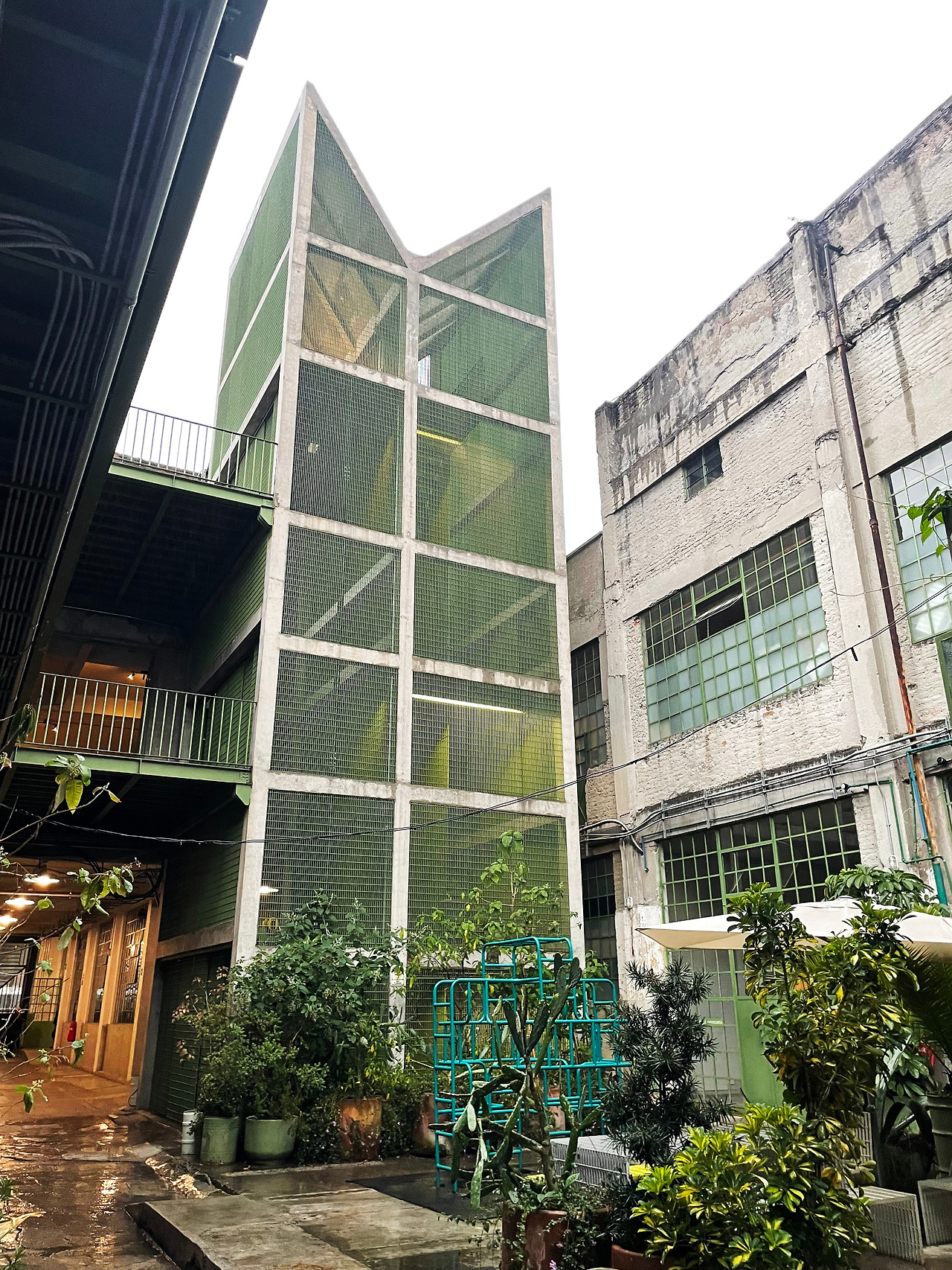 구역 1을 둘러보고 구역 2로 이동하며 마주친 메인 중정에서 건축가의 디자인 의도를 이해할 수 있었다. 메인 중정에는 여러 식재가 계획되어 있었고, 건물 양쪽을 연결할 정도로 풍성한 덩굴이 시선을 사로잡았다. 그리고 식재와 함께 보이는 중정은 건축과 조경이 조화를 이루는 풍경이었다. 이 과정에서 건축에 스며든 올리브 색상은 조경과 하나 되는 색상이었다. 건축가는 공장 건물에 조경 계획과 함께 건물 일부에 올리브 색을 칠함으로써 기존 공장의 삭막함에서 탈피하여 친근하고 자연적인 분위기를 연출한 것이었다. 또한 건축가는 벽, 기둥, 보와 같은 건축의 핵심 구성요소는 철근 콘크리트를 그대로 노출하며 기존 공장의 거친 모습을 유지하였고, 창틀, 문, 난간과 같은 부차적인 요소에는 올리브 색을 칠하여 현대적인 감각을 녹여냈다. 이러한 두 가지 시간이 공존하는 모습은 리모델링 프로젝트에서만 느낄 수 있는 독특한 감각이었다. 중정은 작은 카페를 중심으로 벤치가 놓여 있어서 사람들이 삼삼오오 모일 수 있기에 커뮤니티 공간으로서 기능하고 있었다. 평일에는 여러 사무소 직원들이 나와서 회의를 하거나 휴식을 취하는 공간이고, 주말에는 야외 카페로 활용되었다. 내가 답사한 여러 멕시코 건물, 특히 오피스 건물은 공원까지 나가지 않고도 잘 계획된 정원이나 중정을 통해 풍요로운 공간을 향유하고 있었다. 확실히 멕시코인들의 조경 디자인과 공용 공간에 대한 감각은 우리와 무척 다르다고 느껴졌다.