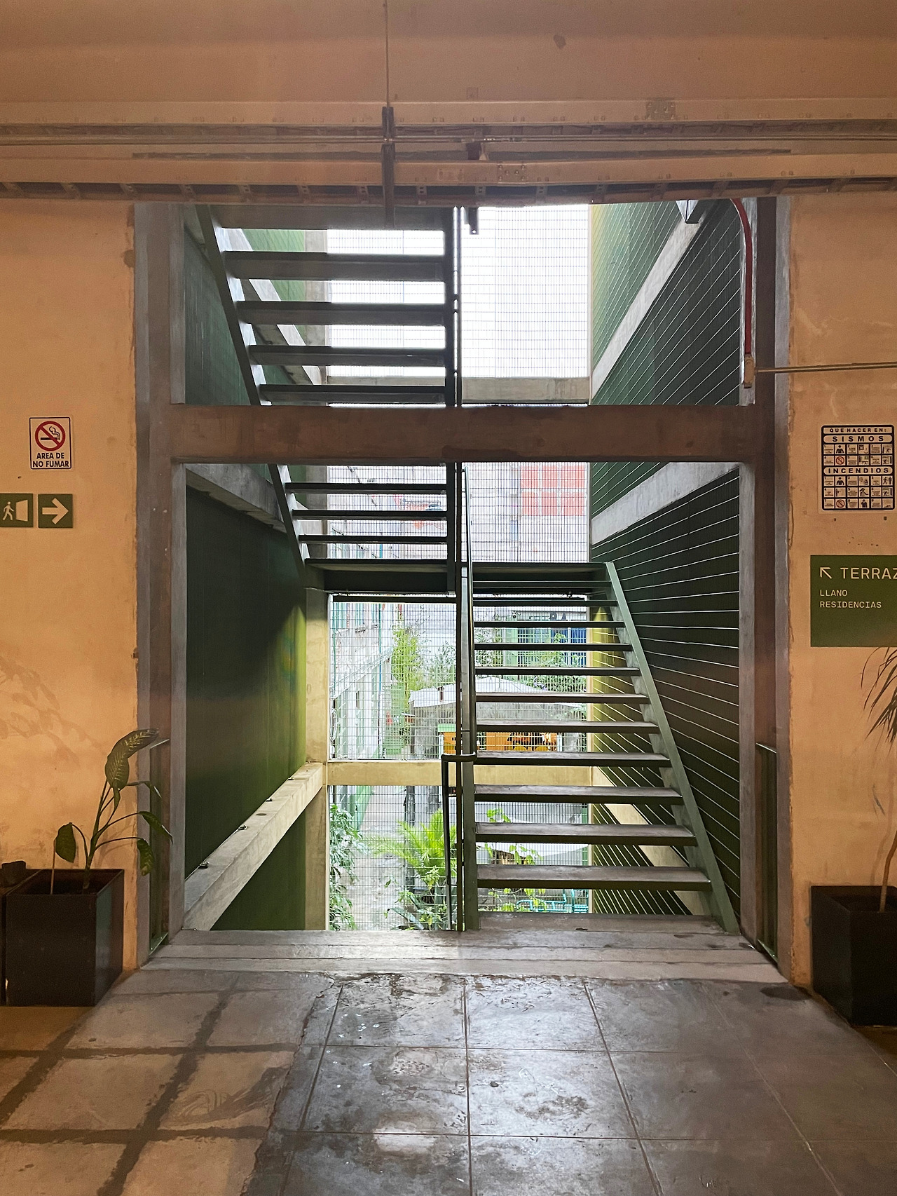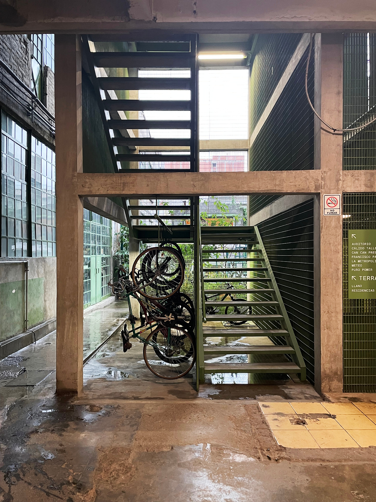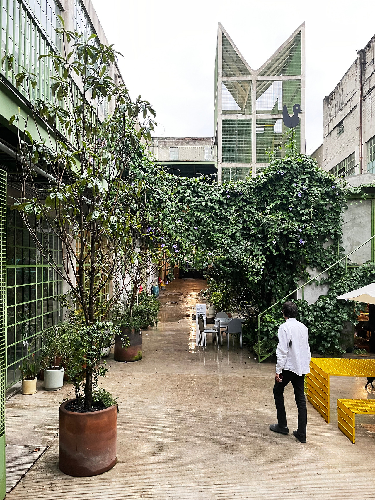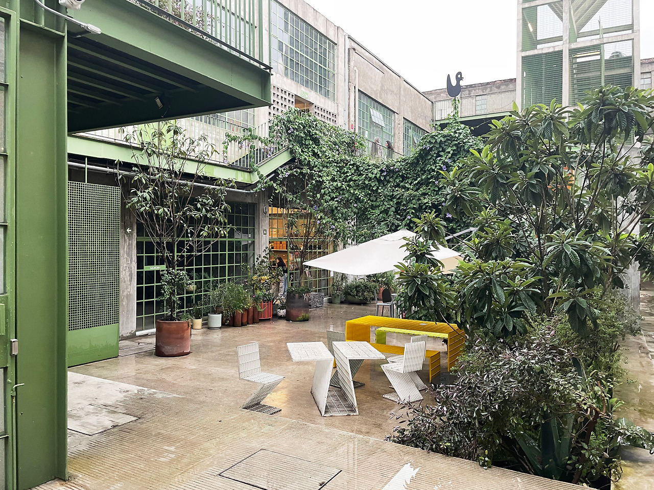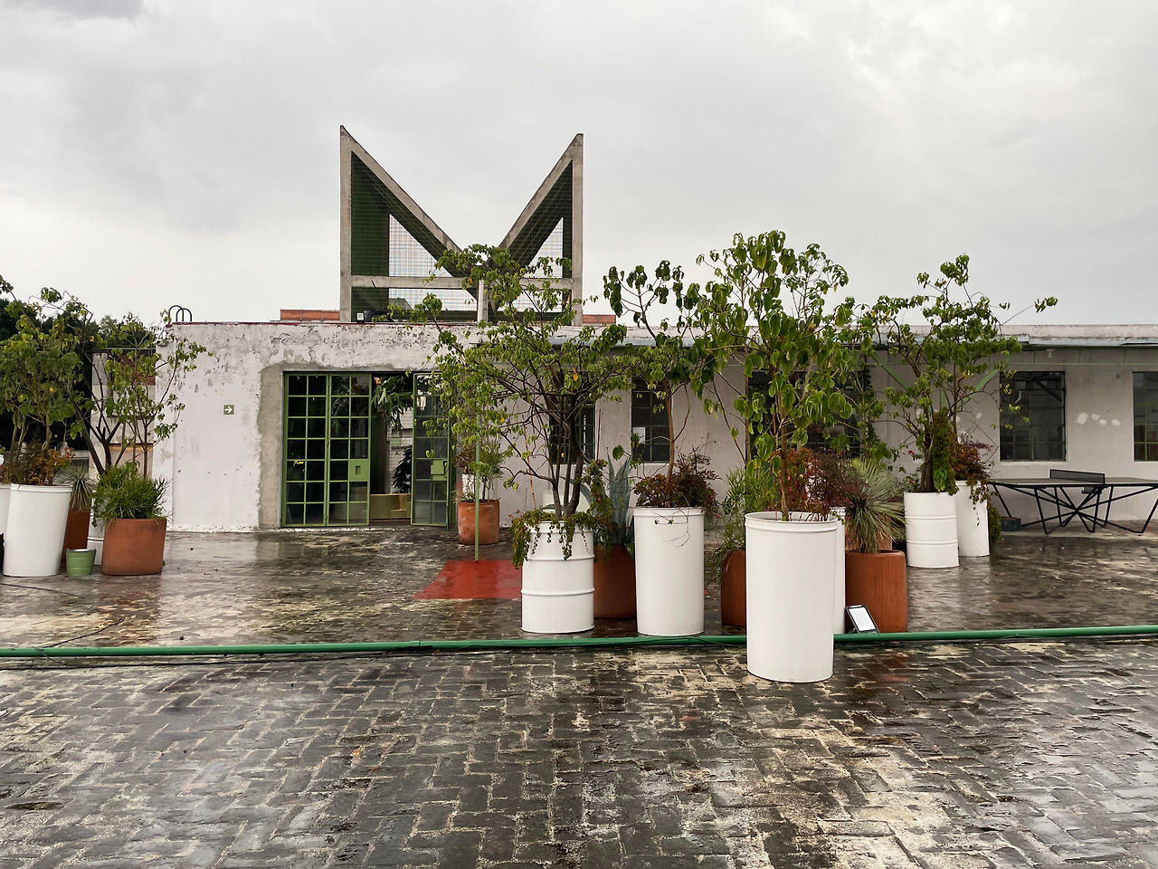 구역 1을 둘러보고 구역 2로 이동하며 마주친 메인 중정에서 건축가의 디자인 의도를 이해할 수 있었다. 메인 중정에는 여러 식재가 계획되어 있었고, 건물 양쪽을 연결할 정도로 풍성한 덩굴이 시선을 사로잡았다. 그리고 식재와 함께 보이는 중정은 건축과 조경이 조화를 이루는 풍경이었다. 이 과정에서 건축에 스며든 올리브 색상은 조경과 하나 되는 색상이었다. 건축가는 공장 건물에 조경 계획과 함께 건물 일부에 올리브 색을 칠함으로써 기존 공장의 삭막함에서 탈피하여 친근하고 자연적인 분위기를 연출한 것이었다. 또한 건축가는 벽, 기둥, 보와 같은 건축의 핵심 구성요소는 철근 콘크리트를 그대로 노출하며 기존 공장의 거친 모습을 유지하였고, 창틀, 문, 난간과 같은 부차적인 요소에는 올리브 색을 칠하여 현대적인 감각을 녹여냈다. 이러한 두 가지 시간이 공존하는 모습은 리모델링 프로젝트에서만 느낄 수 있는 독특한 감각이었다. 중정은 작은 카페를 중심으로 벤치가 놓여 있어서 사람들이 삼삼오오 모일 수 있기에 커뮤니티 공간으로서 기능하고 있었다. 평일에는 여러 사무소 직원들이 나와서 회의를 하거나 휴식을 취하는 공간이고, 주말에는 야외 카페로 활용되었다. 내가 답사한 여러 멕시코 건물, 특히 오피스 건물은 공원까지 나가지 않고도 잘 계획된 정원이나 중정을 통해 풍요로운 공간을 향유하고 있었다. 확실히 멕시코인들의 조경 디자인과 공용 공간에 대한 감각은 우리와 무척 다르다고 느껴졌다.