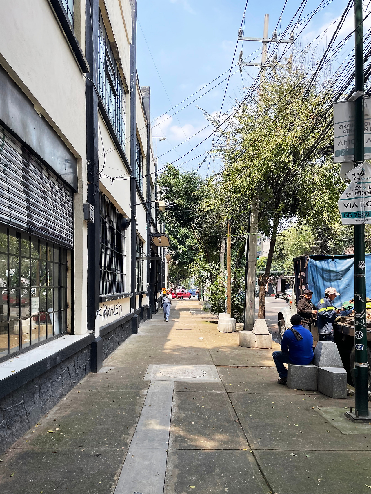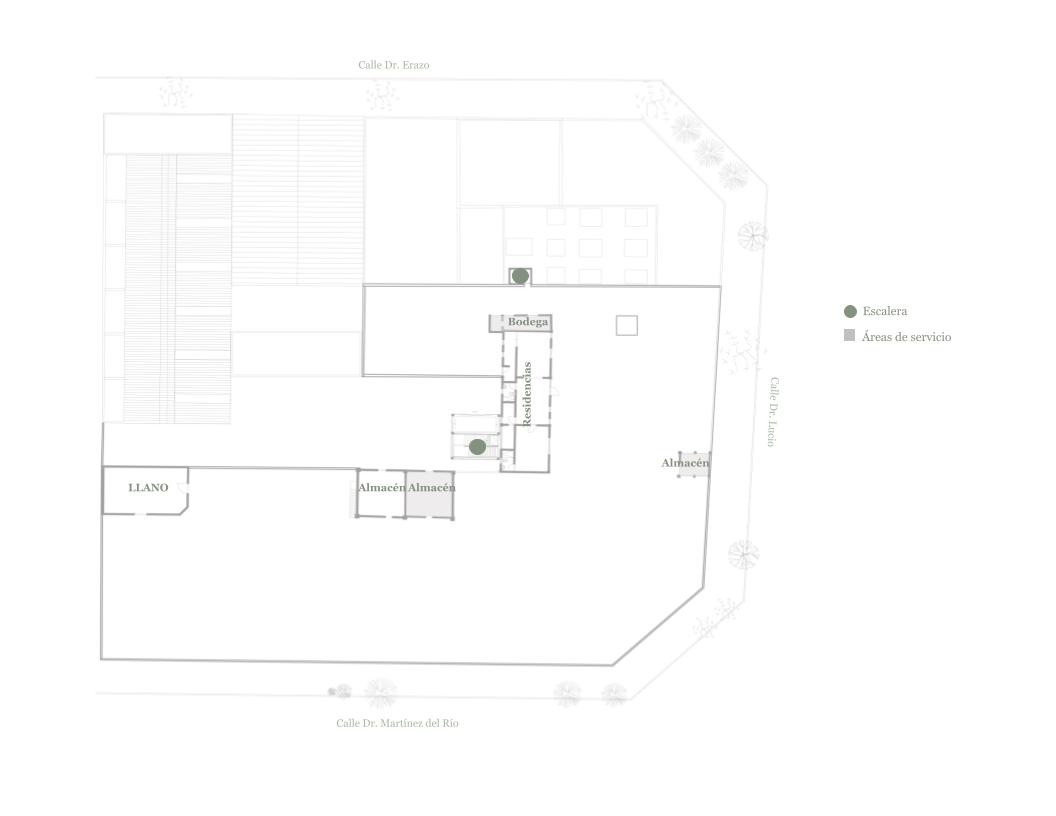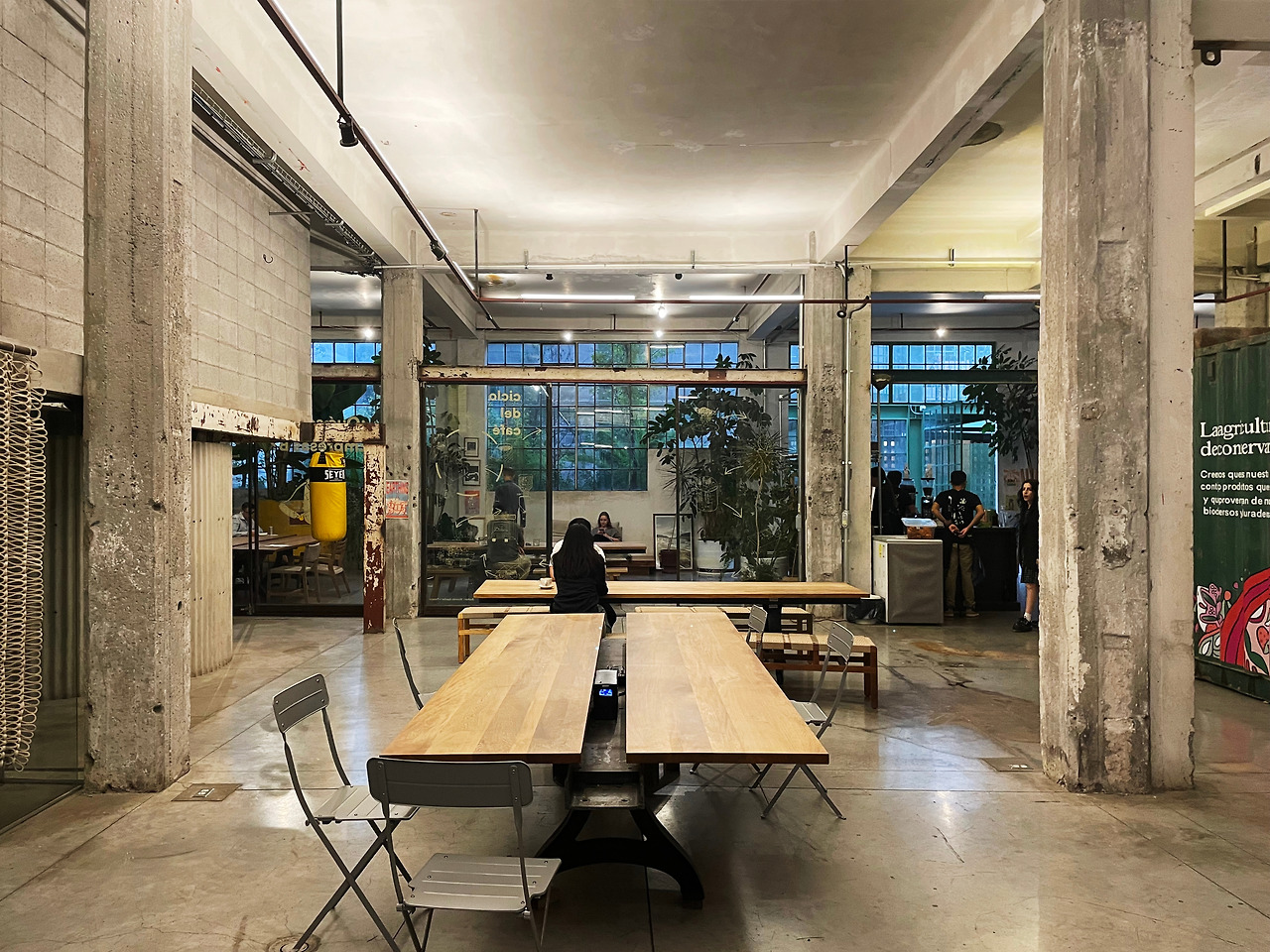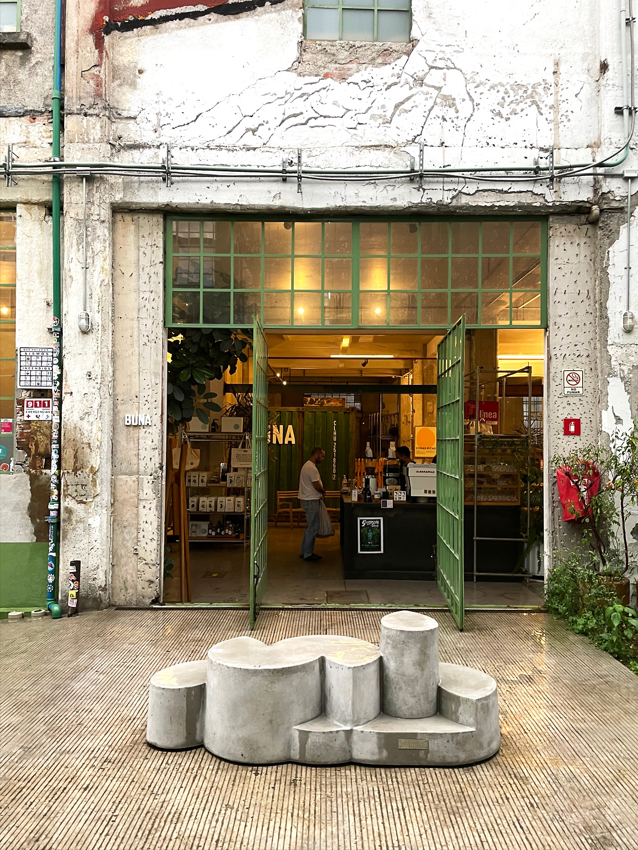 구역 1을 둘러보고 구역 2로 이동하며 마주친 메인 중정에서 건축가의 디자인 의도를 이해할 수 있었다. 메인 중정에는 여러 식재가 계획되어 있었고, 건물 양쪽을 연결할 정도로 풍성한 덩굴이 시선을 사로잡았다. 그리고 식재와 함께 보이는 중정은 건축과 조경이 조화를 이루는 풍경이었다. 이 과정에서 건축에 스며든 올리브 색상은 조경과 하나 되는 색상이었다. 건축가는 공장 건물에 조경 계획과 함께 건물 일부에 올리브 색을 칠함으로써 기존 공장의 삭막함에서 탈피하여 친근하고 자연적인 분위기를 연출한 것이었다. 또한 건축가는 벽, 기둥, 보와 같은 건축의 핵심 구성요소는 철근 콘크리트를 그대로 노출하며 기존 공장의 거친 모습을 유지하였고, 창틀, 문, 난간과 같은 부차적인 요소에는 올리브 색을 칠하여 현대적인 감각을 녹여냈다. 이러한 두 가지 시간이 공존하는 모습은 리모델링 프로젝트에서만 느낄 수 있는 독특한 감각이었다. 중정은 작은 카페를 중심으로 벤치가 놓여 있어서 사람들이 삼삼오오 모일 수 있기에 커뮤니티 공간으로서 기능하고 있었다. 평일에는 여러 사무소 직원들이 나와서 회의를 하거나 휴식을 취하는 공간이고, 주말에는 야외 카페로 활용되었다. 내가 답사한 여러 멕시코 건물, 특히 오피스 건물은 공원까지 나가지 않고도 잘 계획된 정원이나 중정을 통해 풍요로운 공간을 향유하고 있었다. 확실히 멕시코인들의 조경 디자인과 공용 공간에 대한 감각은 우리와 무척 다르다고 느껴졌다.