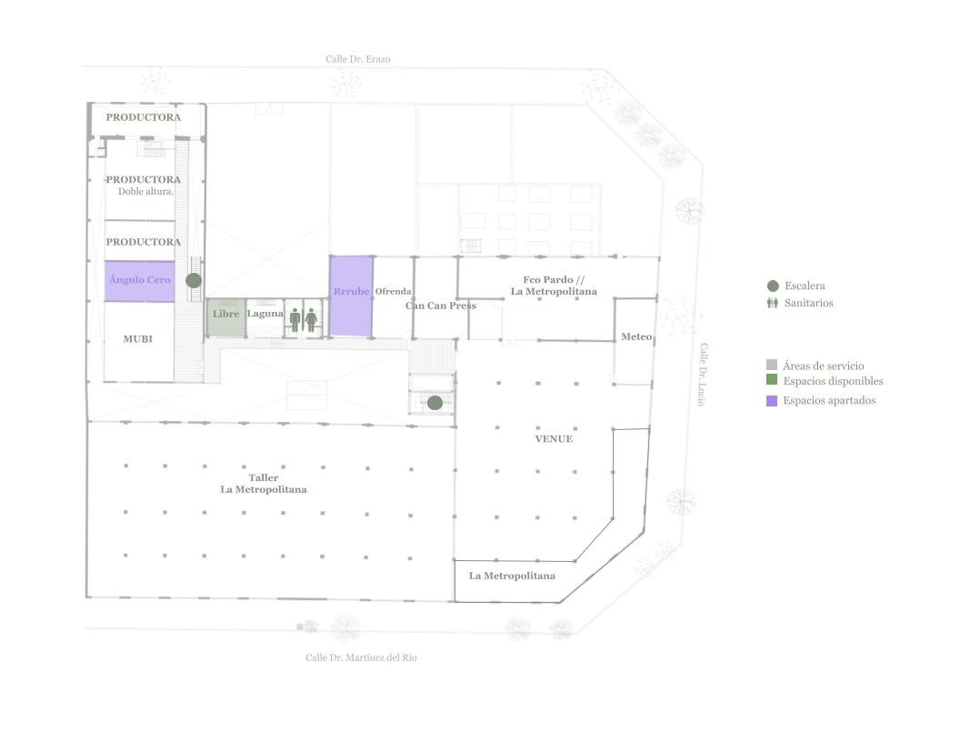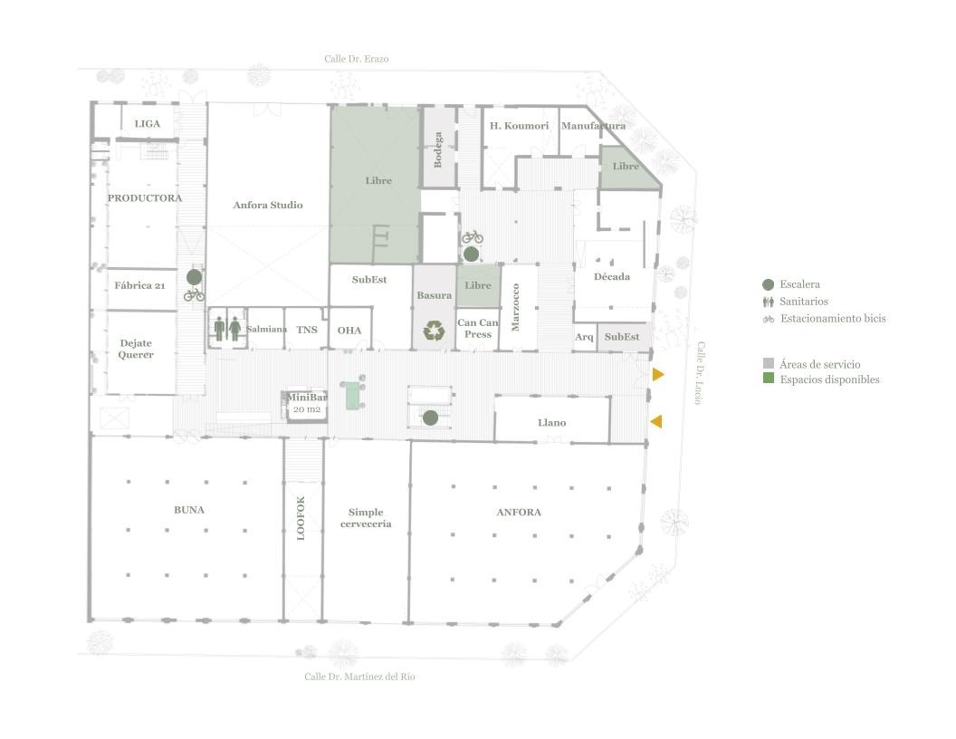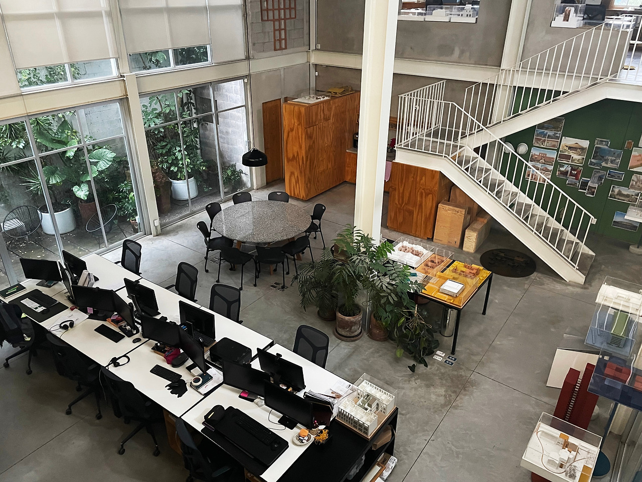 메인 중정과 계단실을 둘러보고 나서 건물 내부를 돌아보았다. 건물 좌측에는 카페를 운영하고 있었고, 우측에는 다양한 디자인 사무소가 있었다. 그중 라구나를 설계한 Productora 건축사사무소가 이곳에 있었고, 회사에서 설계한 주요 건물의 모형과 랜더링을 구경할 수 있었다. 자신이 설계한 건물에서 일을 하는 것은 건축가가 향유할 수 있는 최고의 특권인데 이를 향유하고 있어서 내가 다 기분이 좋았다. 건축가가 내부 인테리어까지 진행하지 않았기에 사무소와 카페는 각기 다른 방식으로 인테리어 디자인이 되어있었다. 내부 복도나 기능 공간에도 올리브 색이 유지될까 하는 점이 궁금했는데 외부와 달리 내부에는 대부분 하얀색 페인트로 마감하여 모던한 분위기를 연출하였다. 이를 통해 올리브 색감이 중정 조경과 깊이 연관되어 있을 것이라는 추측이 확신으로 바뀌는 순간이었다.