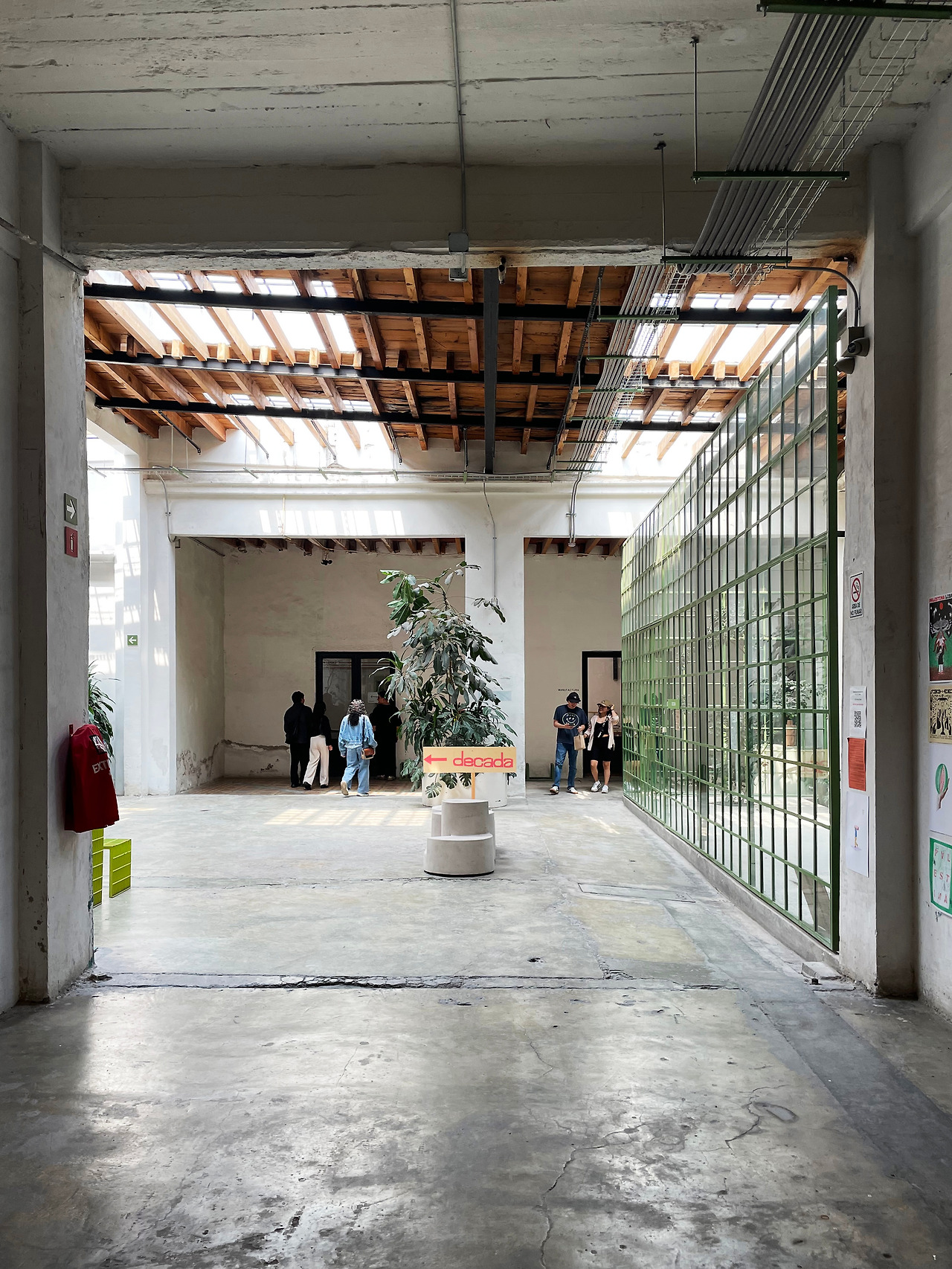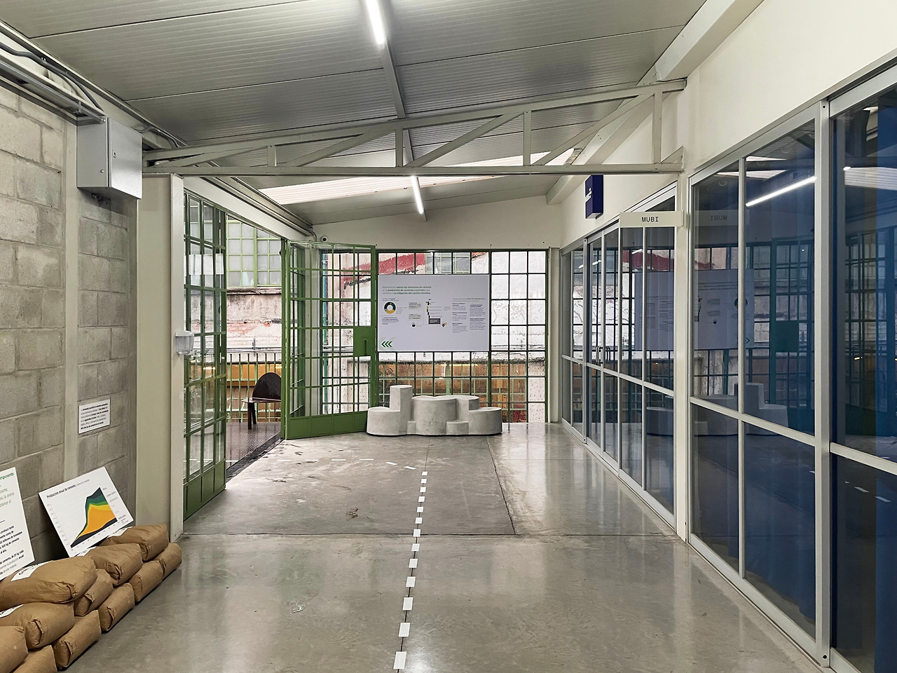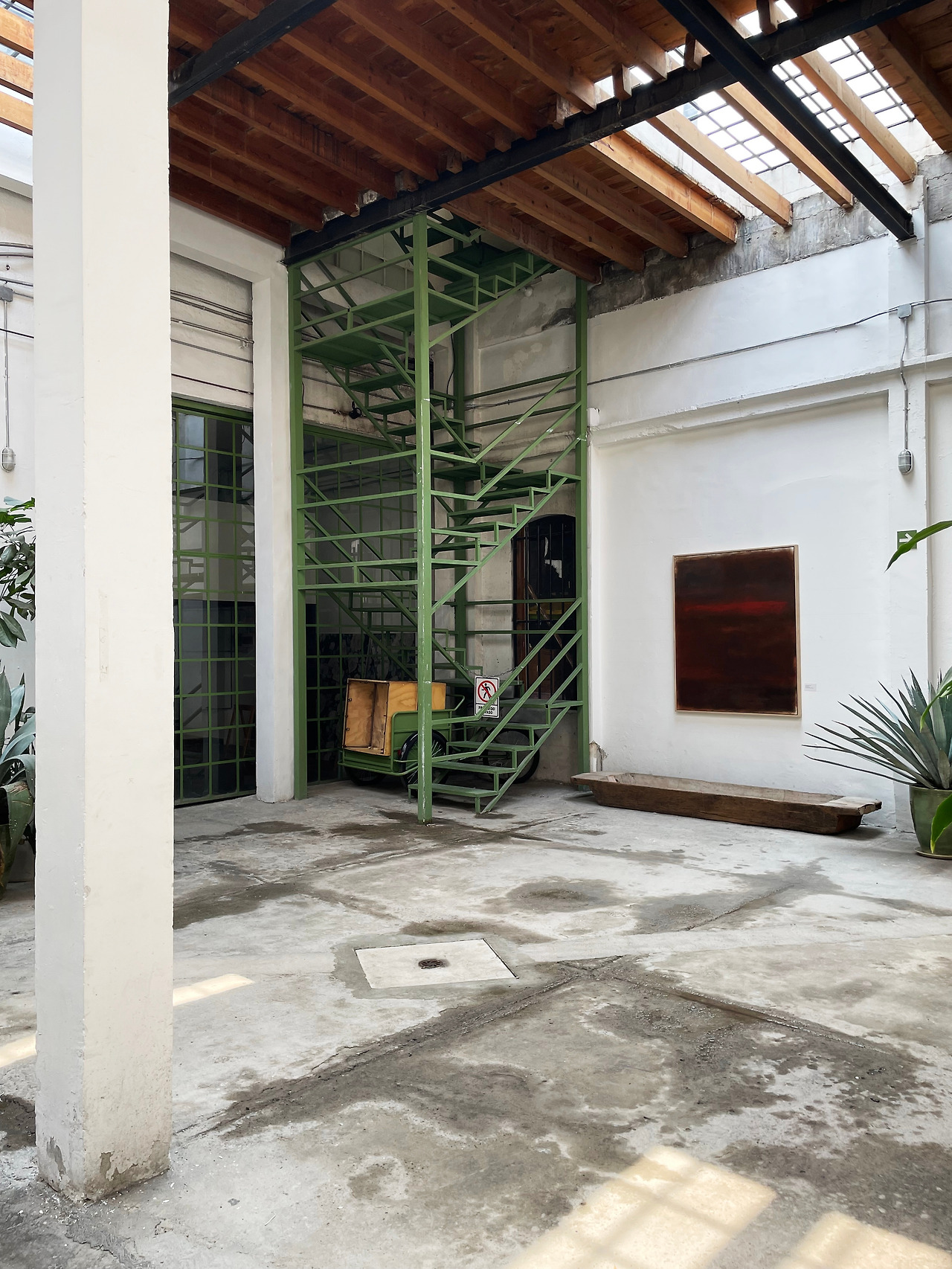 내부를 살펴보고 2층의 외부 통로를 따라 이동하였다. 기존 건물에는 없었던 동선이었지만, 공장에서 상업 및 오피스 공간으로 리모델링하며 새롭게 계획되었다. 외부 통로를 걸으며 다시 한번 다른 시점에서 중정을 관찰할 수 있었다. 그렇게 천천히 중정을 구경하며 걸어 전면부 건물로 이동하였다. 건물은 후면부와 달리 구조만 존재하는 공간이었다. 가구 판매점이 위치하여 여러 가구가 나열되어 있고, 사람들이 구매를 할 수 있는 장소인 것 같았다. 그리고 일부 칸에는 건축 전시가 이루어지고 있었다. 멕시코에 지어진 주택에 관한 전시여서 잠시 살펴보고 마지막 옥상층으로 이동하였다.