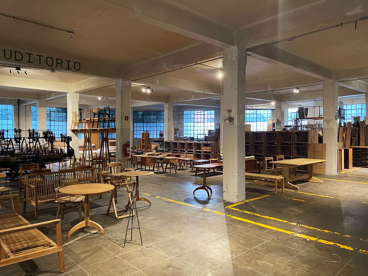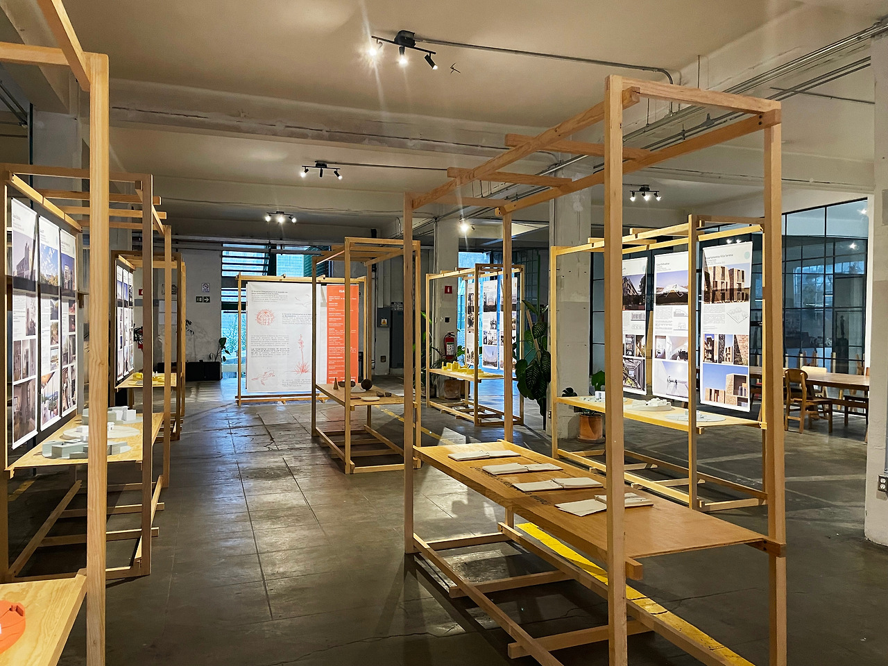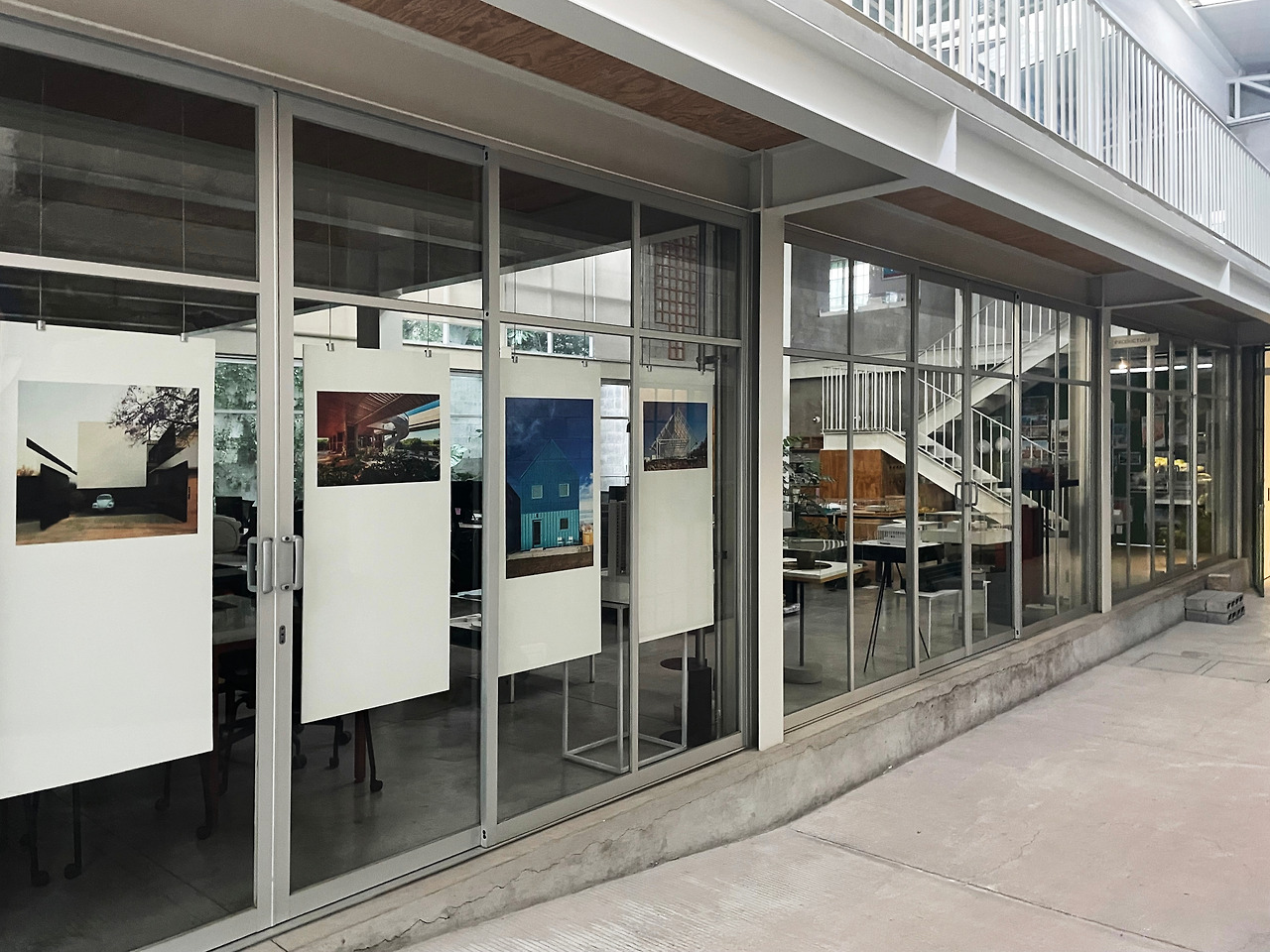 내부를 살펴보고 2층의 외부 통로를 따라 이동하였다. 기존 건물에는 없었던 동선이었지만, 공장에서 상업 및 오피스 공간으로 리모델링하며 새롭게 계획되었다. 외부 통로를 걸으며 다시 한번 다른 시점에서 중정을 관찰할 수 있었다. 그렇게 천천히 중정을 구경하며 걸어 전면부 건물로 이동하였다. 건물은 후면부와 달리 구조만 존재하는 공간이었다. 가구 판매점이 위치하여 여러 가구가 나열되어 있고, 사람들이 구매를 할 수 있는 장소인 것 같았다. 그리고 일부 칸에는 건축 전시가 이루어지고 있었다. 멕시코에 지어진 주택에 관한 전시여서 잠시 살펴보고 마지막 옥상층으로 이동하였다.