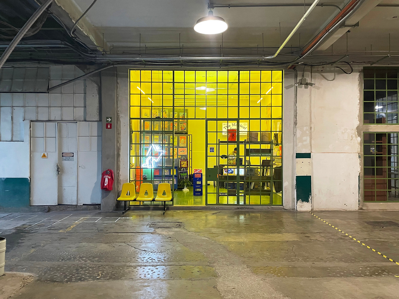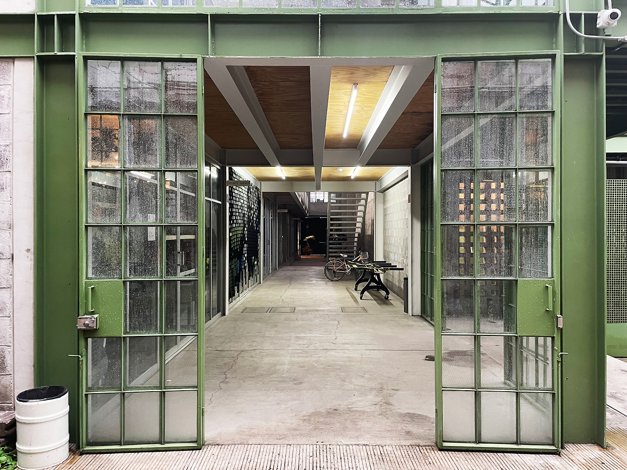 정문을 지나 카운터 인테리어 벽의 올리브색이 시선을 사로잡았다. 카운터에서 입장 등록을 하고 통로를 지나 내부로 진입하니 올리브 색이 칠해진 건축 요소가 눈에 띄었다. (카운터 벽은 복선이었다) 검은색과 흰색, 유리와 철로 계획된 근대적인 공장단지에서, 건물 곳곳에 칠해진 올리브 색으로 인하여 내부 공간이 활기를 띠며 현대적인 풍경으로 전환되었다. 통로를 따라 우측에 위치한 구역 1을 먼저 둘러보았다. 각각의 실은 작업실로 사용되고 있었고 주말이어서인지 다양한 종류의 창작물만 놓여있고 따로 사람은 없었다. 천창에서 떨어지는 빛을 품은 중정을 중심으로 작업실이 배치되어 있었다. 빛과 함께 계단, 창틀, 문과 간판까지 올리브 색이 칠해져 있었고, 이로 인하여 공간 자체가 통일감 있게 느껴졌다. 그리고 이때부터 디자인 과정에서 왜 올리브색을 칠했을까 하는 궁금증이 떠올랐다.