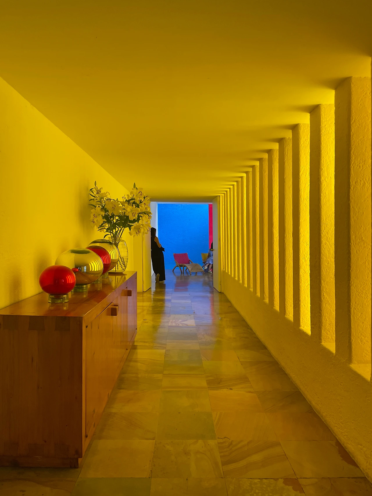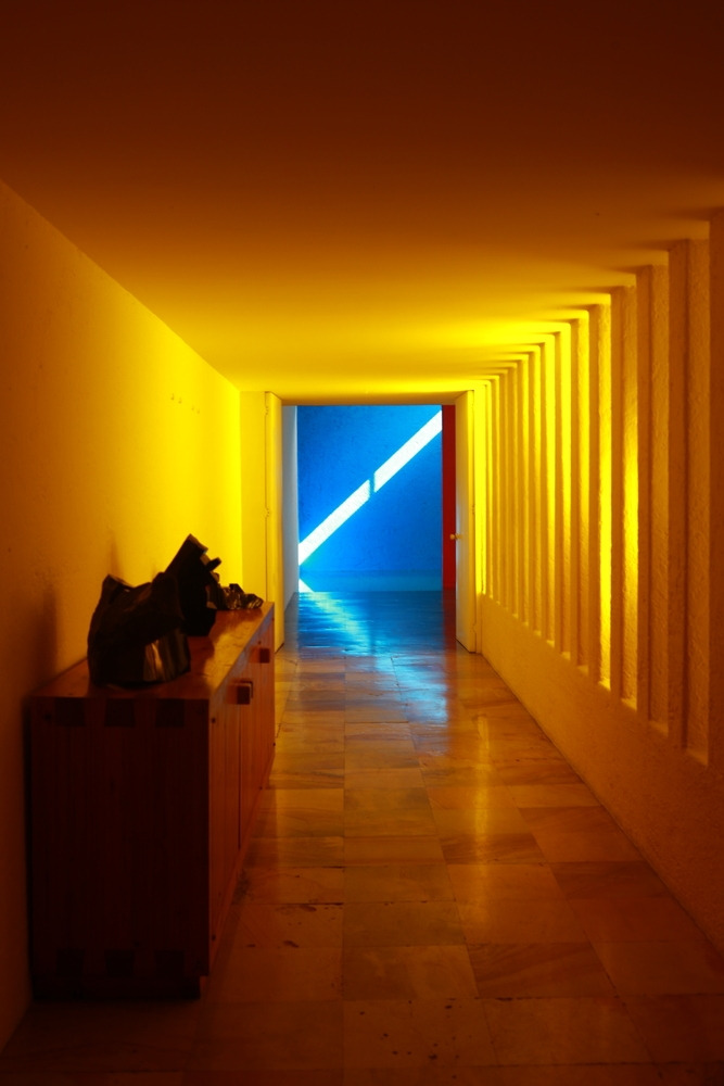 감상에 빠졌던 시간에서 돌아와 통로 공간에서 궁금했던 점들을 해결할 수 있었다. 우선 프레임 없는 창과 페인트(?) 칠을 통해 창 계획을 하였고, 이를 통해 노란빛이 들어올 수 있었다. 이것은 우리가 소위 밖을 볼 수 있는 개념의 창과는 전혀 다른, 빛을 머금은 색을 만들어내기 위한 창이었다. 길라르디 주택의 파티오는 식당과 옥상광장에서 바라볼 수 있기에 통로까지 파티오를 바라보지 않아도 되었고, 수영장으로 가는 길의 새로운 경험을 위하여 시야를 포기하고 빛을 선택했던 것이다. 그리고 통로 뒤로 보이는 빨간 벽과 파란 벽은 통로의 신비감을 두 배로 증폭시켰다. 특히 빨간 벽은 지붕을 지지하기 위하여 구조적으로 필요한 요소였을 텐데, 여기에 색을 칠함으로써 공간의 분위기를 만들어내는 디자인 요소로 전환되었다.